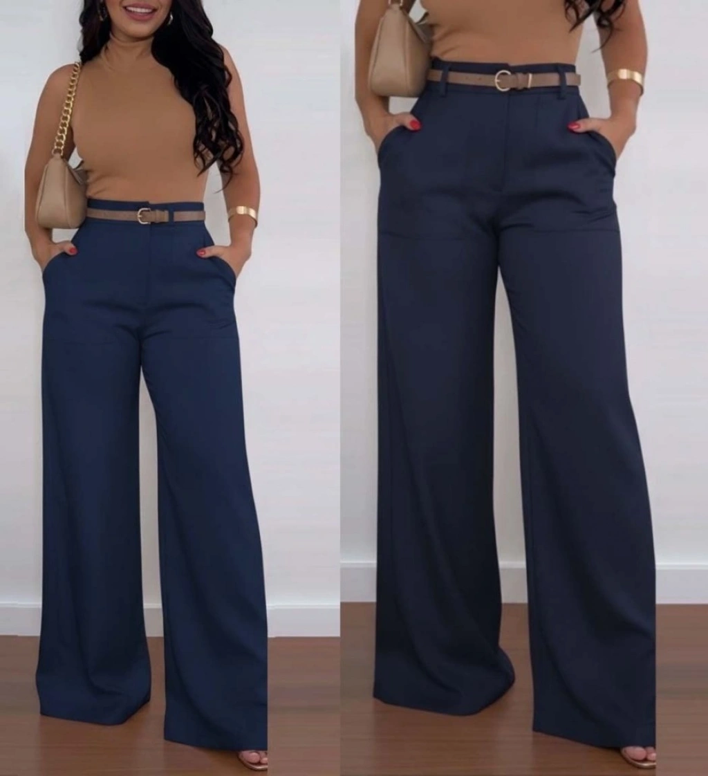 Kadın Yüksek Bel Geniş Paça Detaylı Cepli Ithal Krep Pantolon