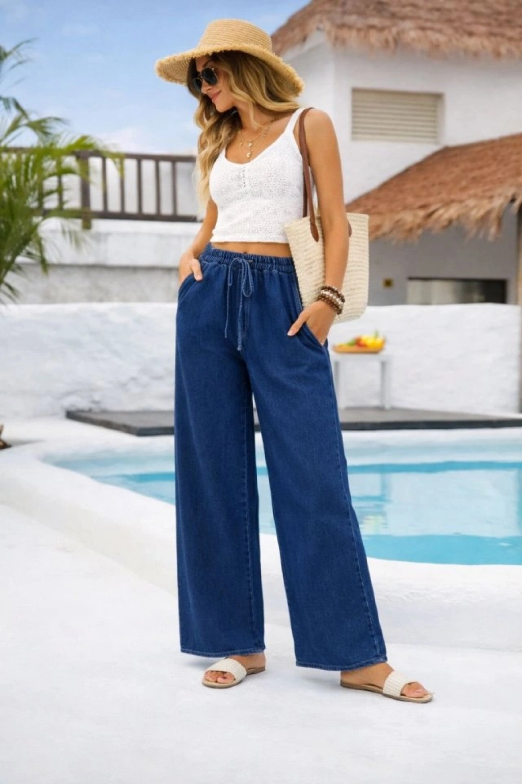 Kadın Yüksek Bel Lastik Detay Bol Paça Pantolon