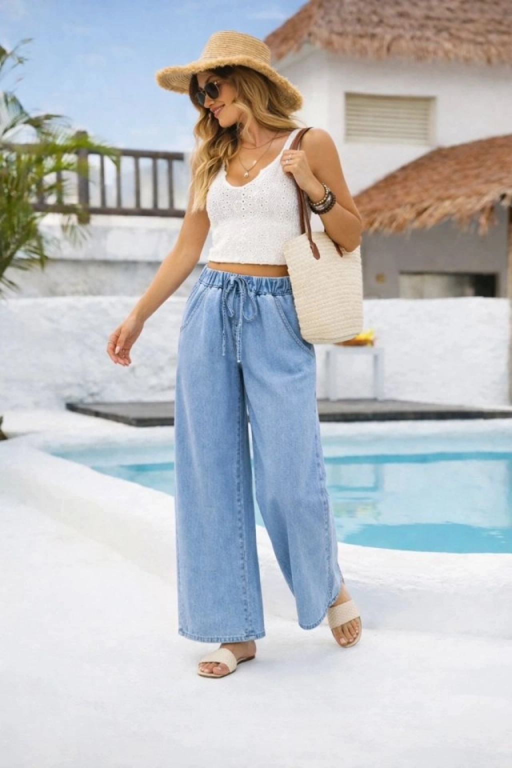 Kadın Yüksek Bel Lastik Detay Bol Paça Pantolon