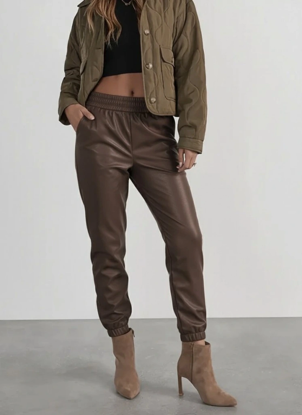 Kadın Yüksek Bel Lastikli önü Düğmeli Deri Pantolon
