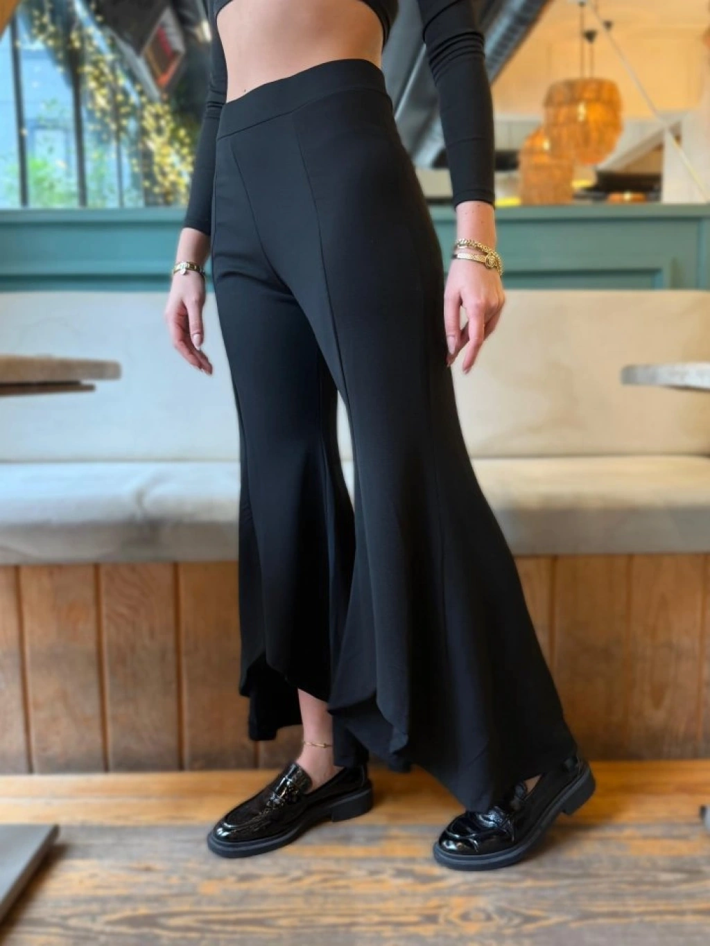 Kadın Yüksek Bel önden Arkaya Uzanan Volanlı Paçalı Janjan Krep Pantolon