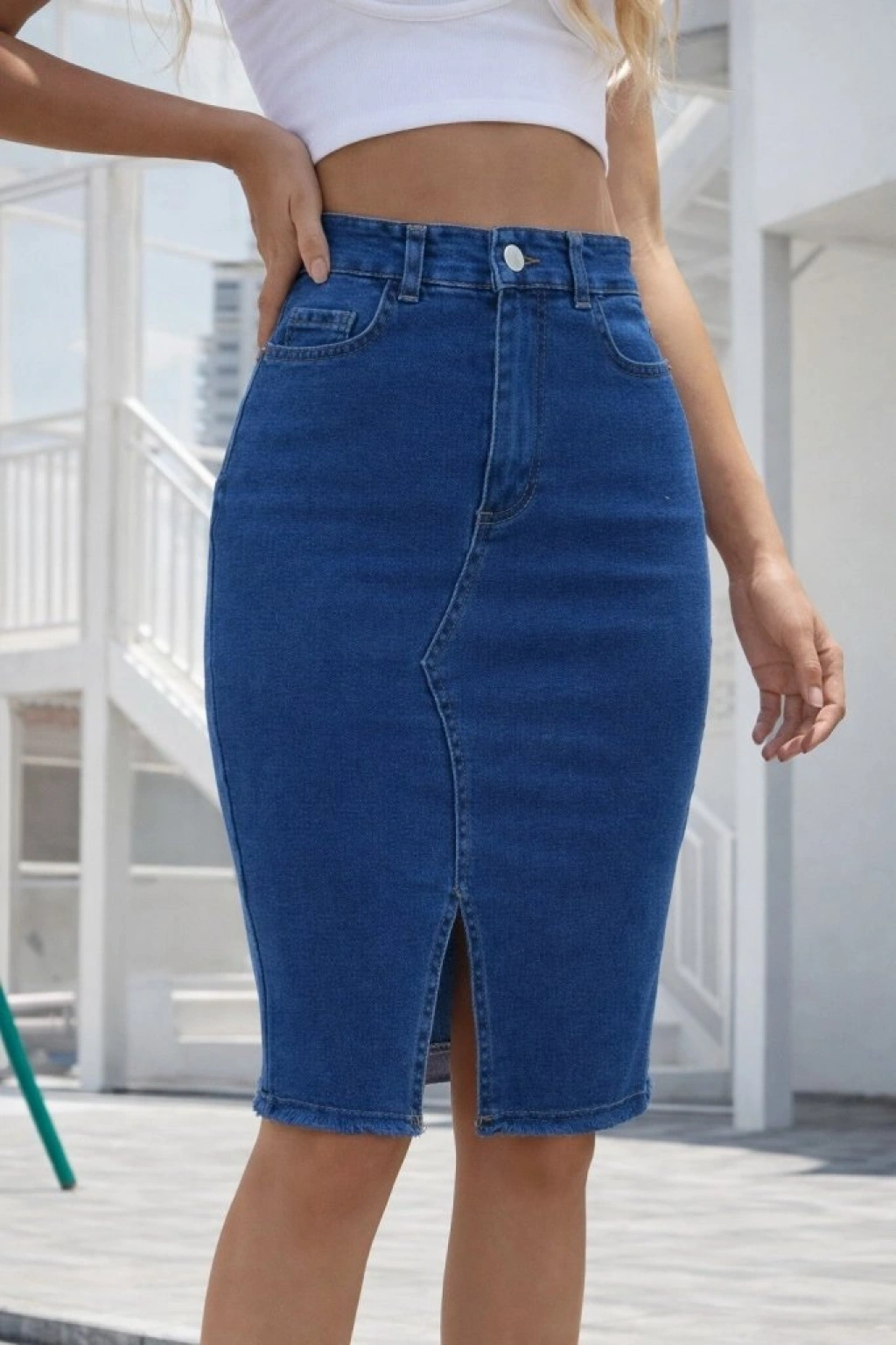 Kadın Yüksek Bel önden Yırtmaçlı Kısa Kot Etek