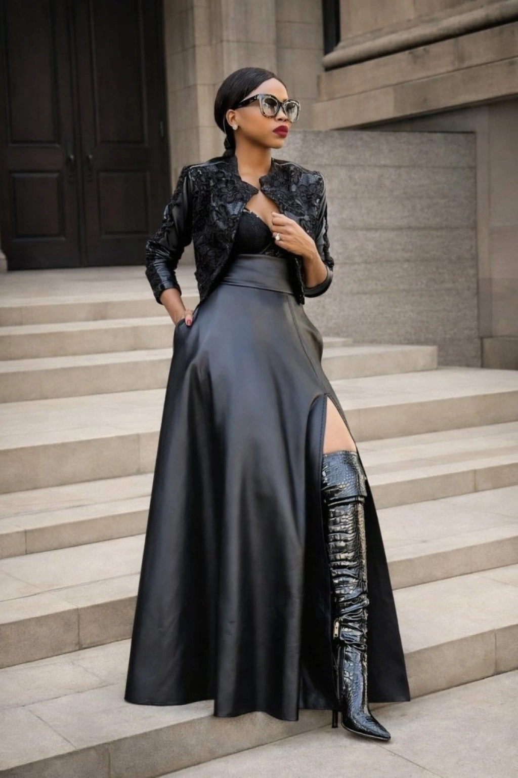 Kadın Yüksek Bel Uzun Yırtmaçlı Deri Etek