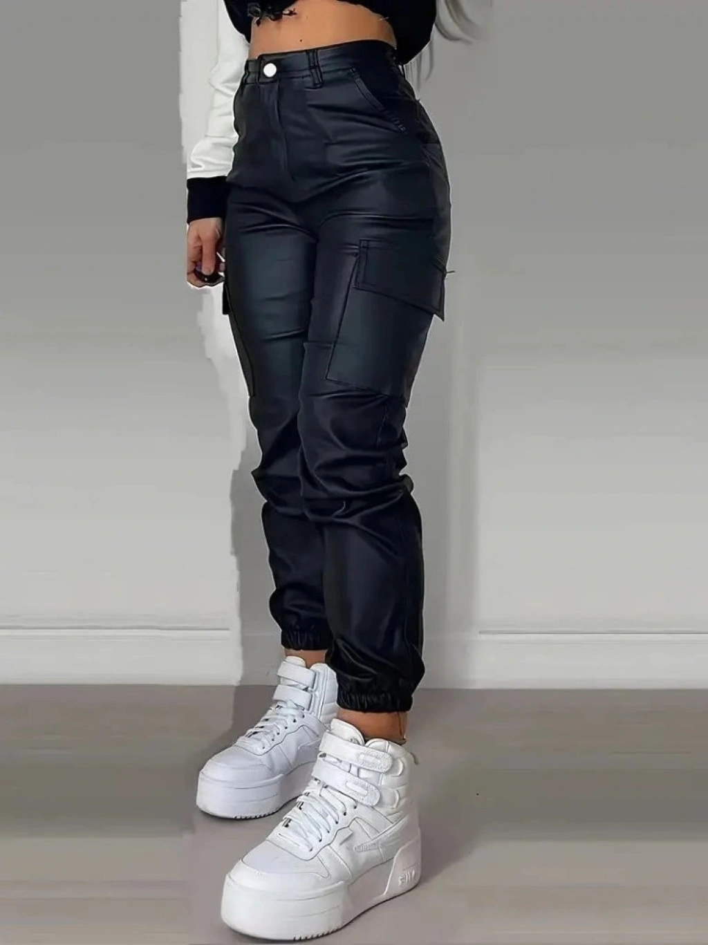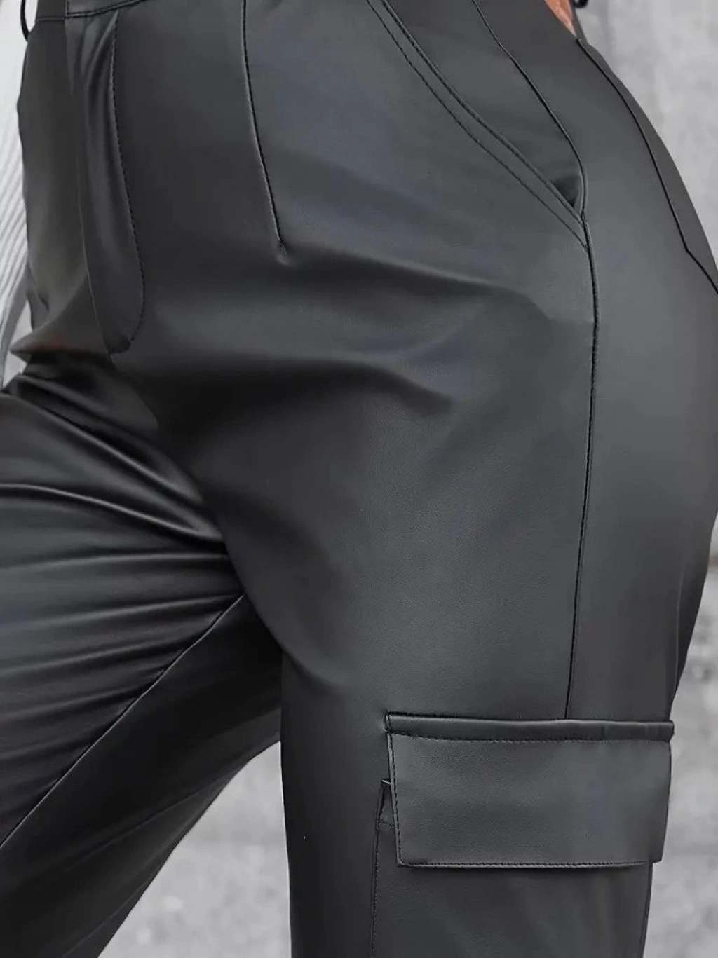 Kadın Yüksek Bel Yan Kargo Cep Detaylı Deri Pantolon