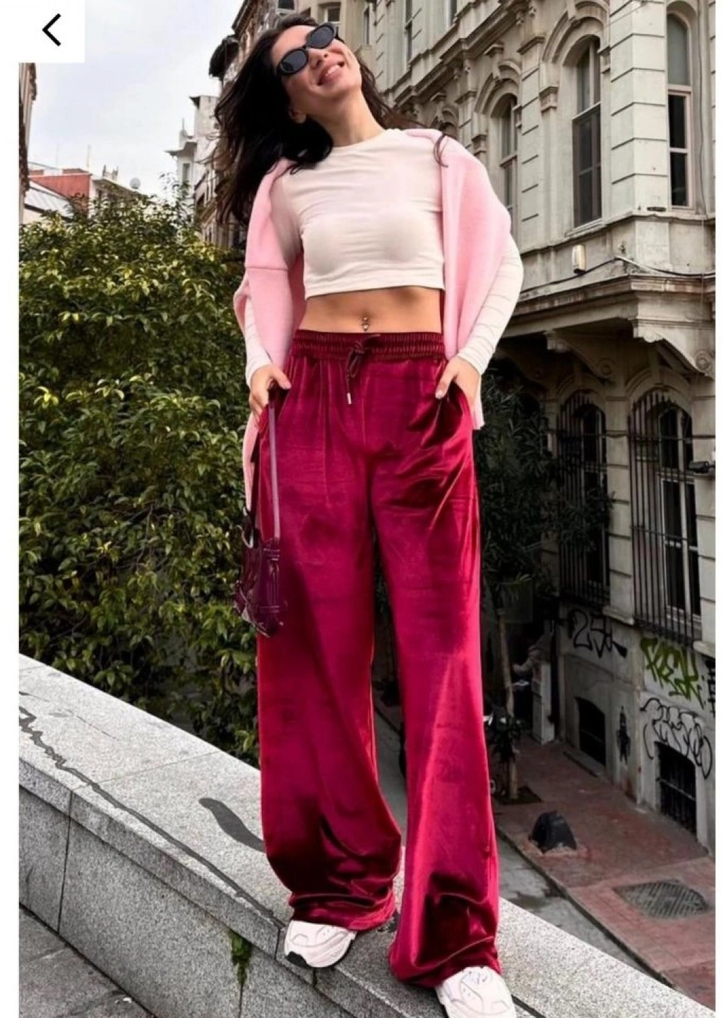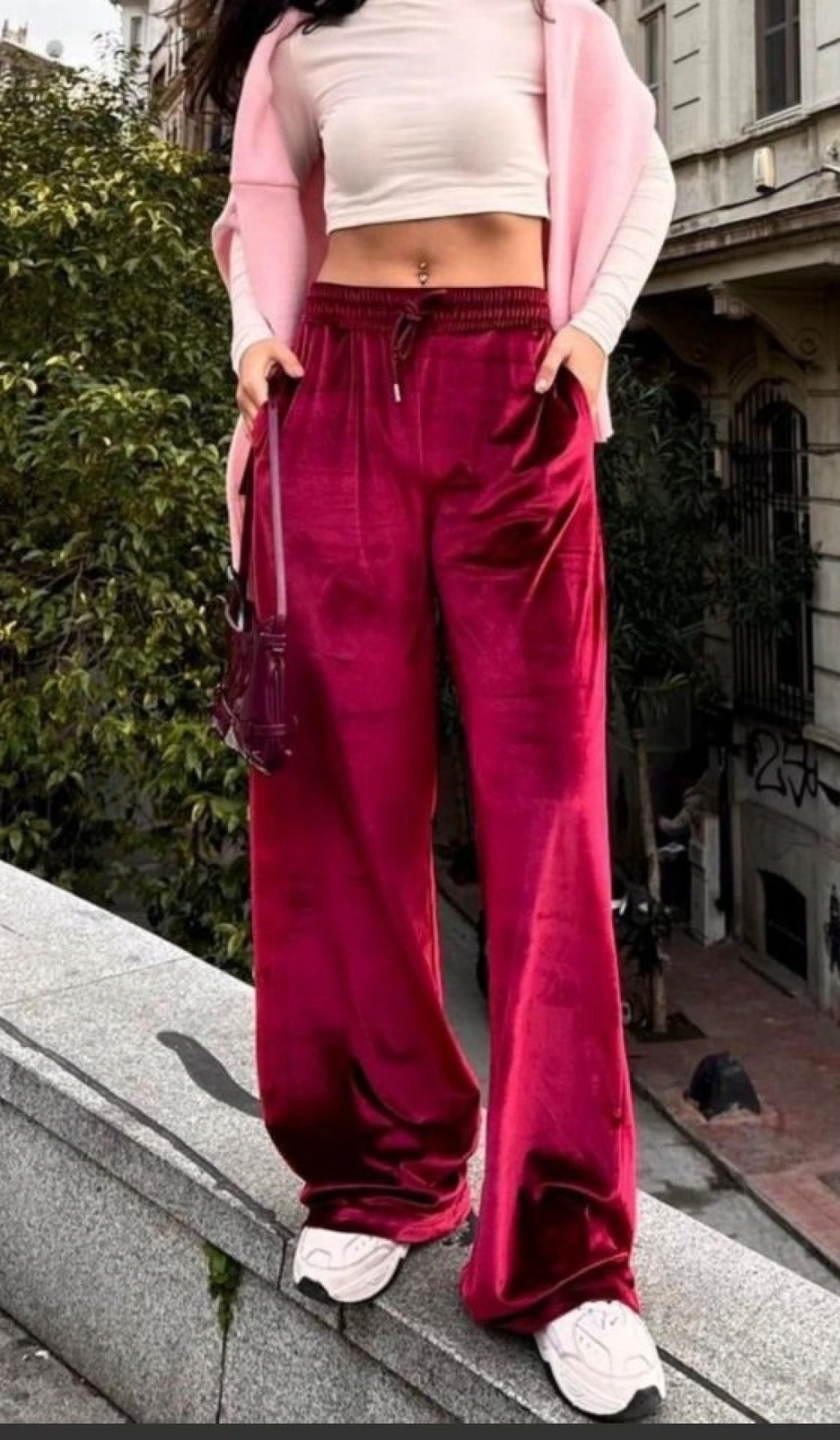 Kadın Yüksek Ben Beli astik Detay Kadife Kumaş Bol Paça Pantolon