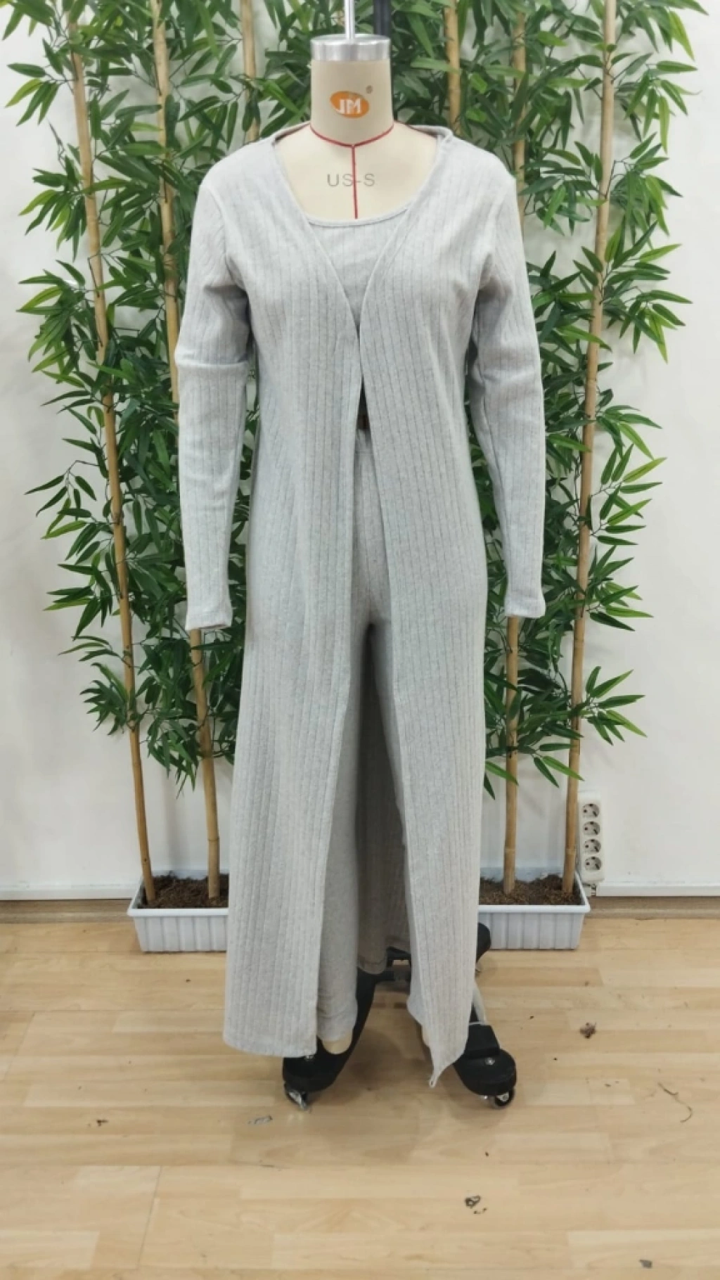 Kadın Yuvarlak Yaka Askılı Krop Bluz Yüksek Bel Tayt Ve Uzun Hırka şardonlu Kaşkorse üçlü Takım