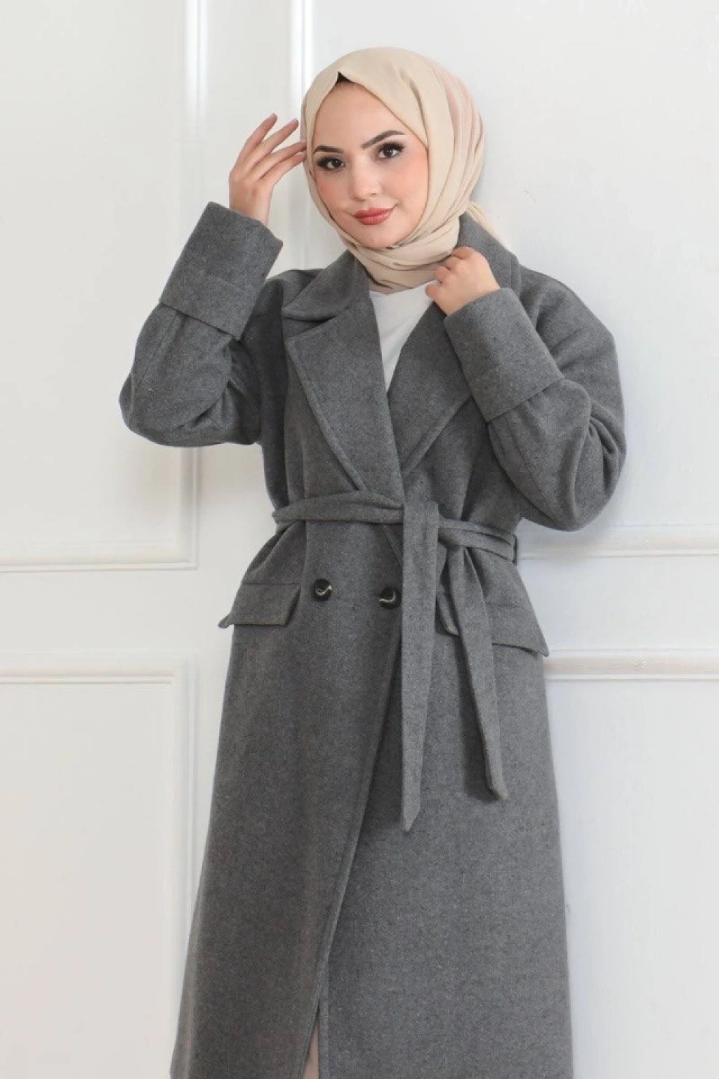 Kaşe Kaban – Uzun Boy Kruvaze Yaka Kuşaklı Tesettür Kaşe Kışlık Kaban, Astarlı Şık Yünlü Dokuma Oversize Rahat Kalıp Cepli Düğmeli Modern Kap Modeli - Gri