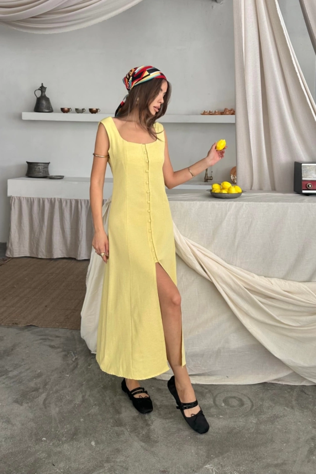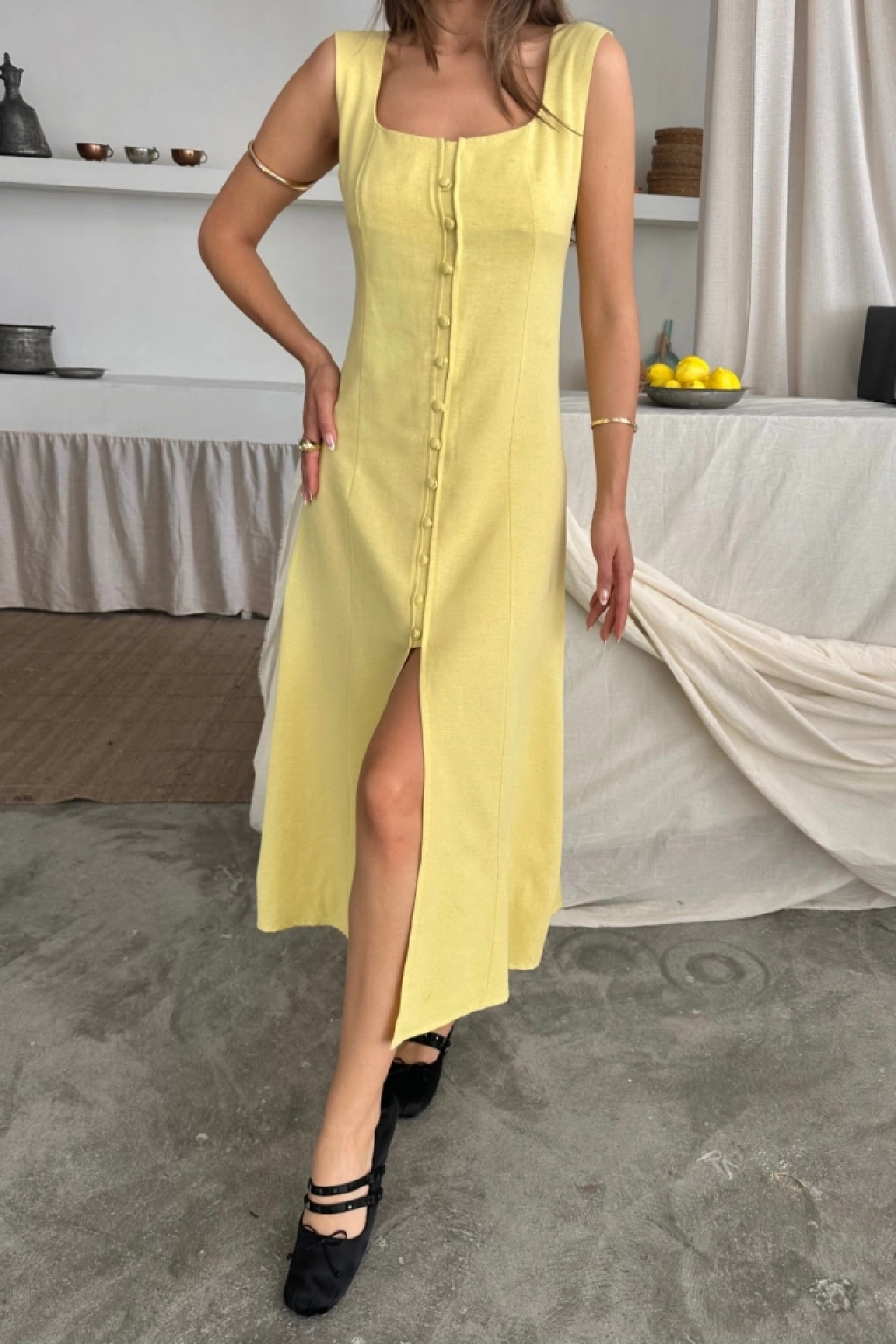 KETEN KOLSUZ KARE YAKA DÜĞME DETAYLI ELBİSE - Sarı