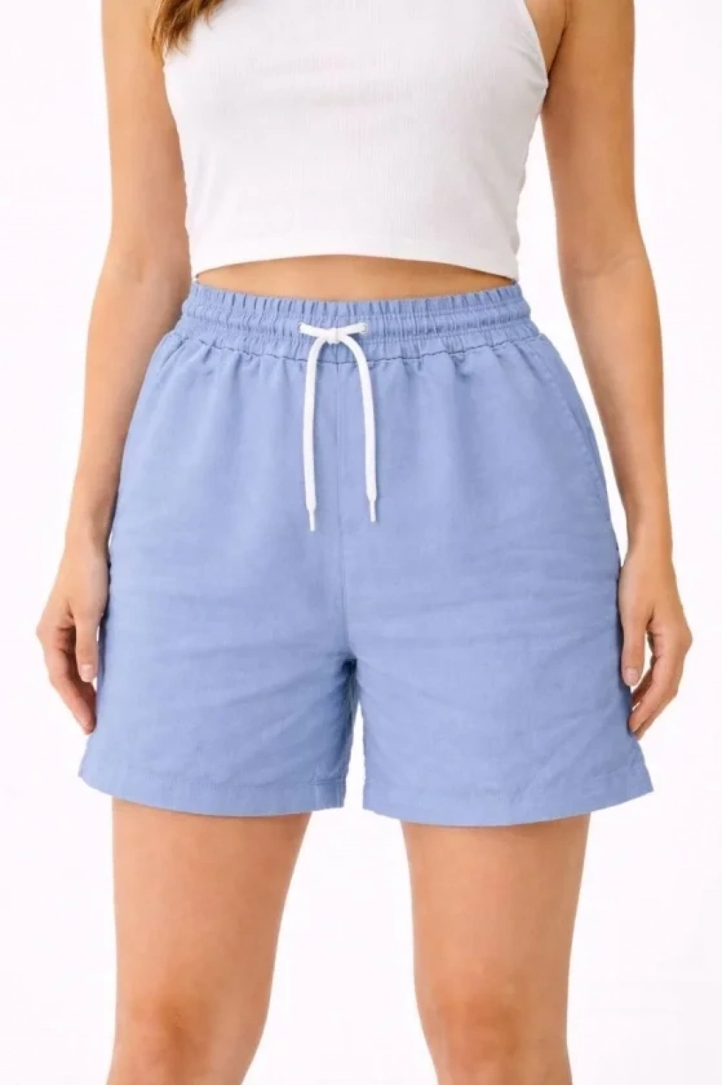 Keten Kumaş Cepli Rahat Kesim Bel Lastikli Şort - Mavi