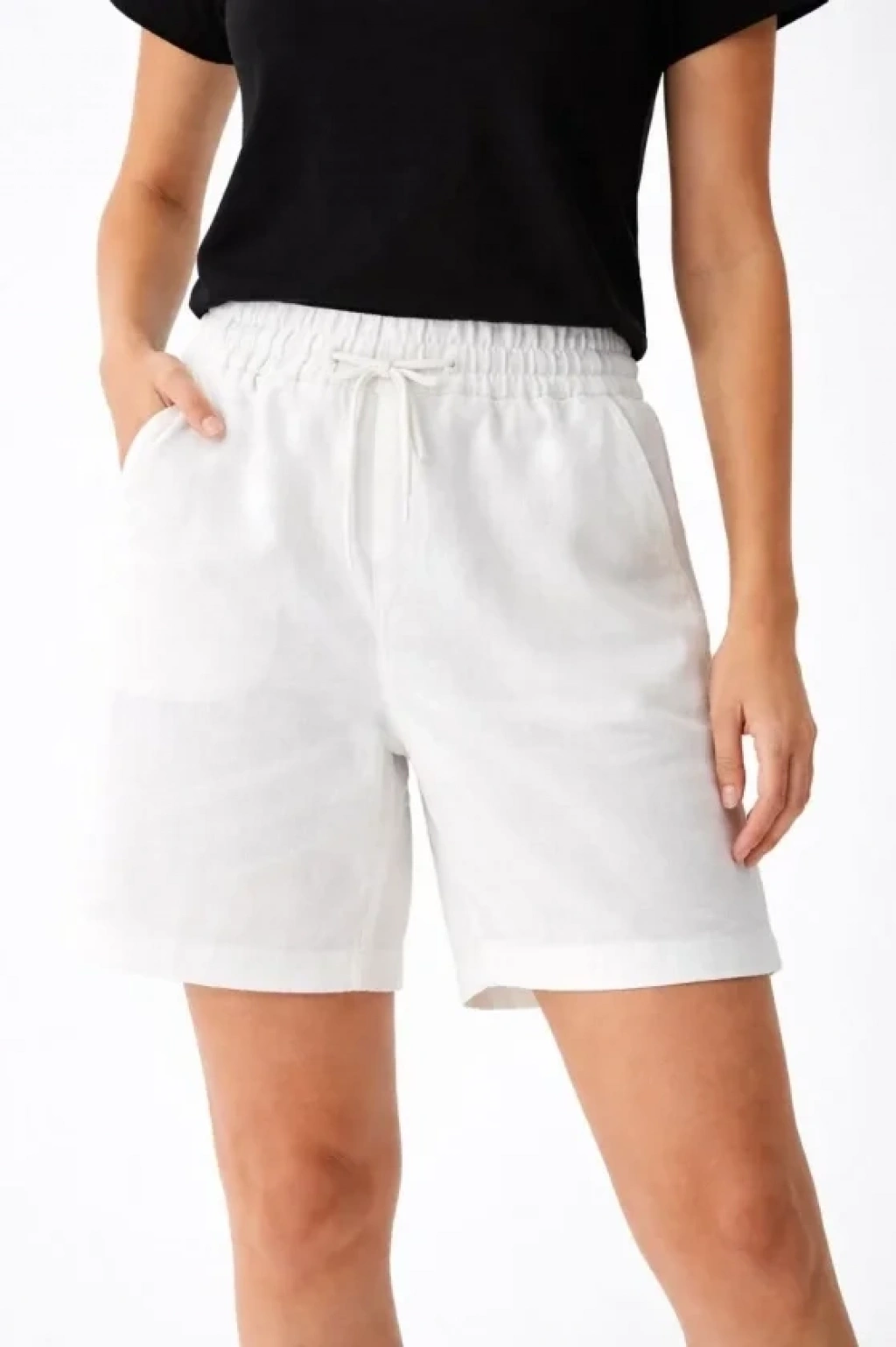 Keten Kumaş Cepli Rahat Kesim Bel Lastikli Şort - Beyaz