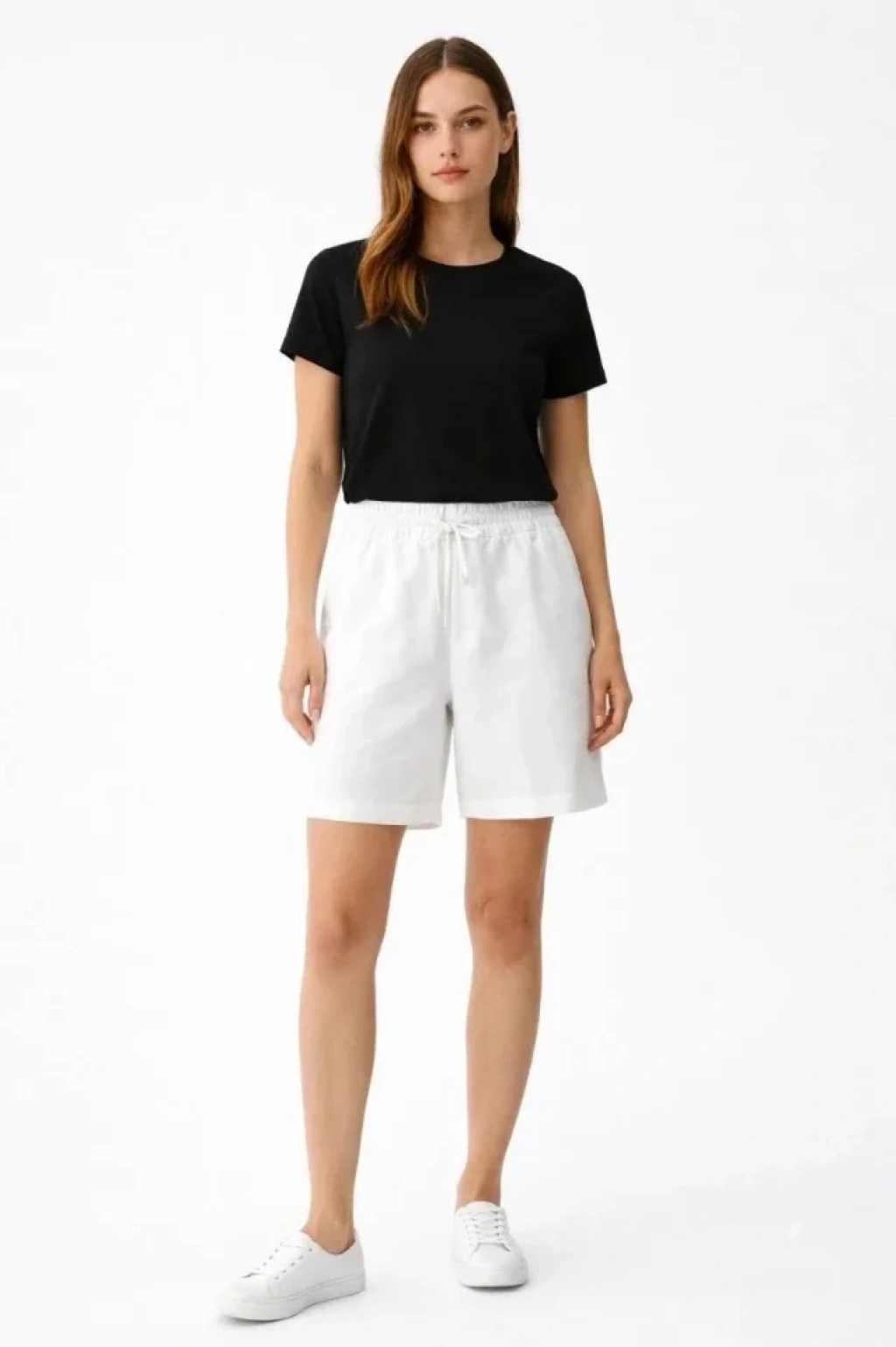 Keten Kumaş Cepli Rahat Kesim Bel astikli Şort Beyaz
