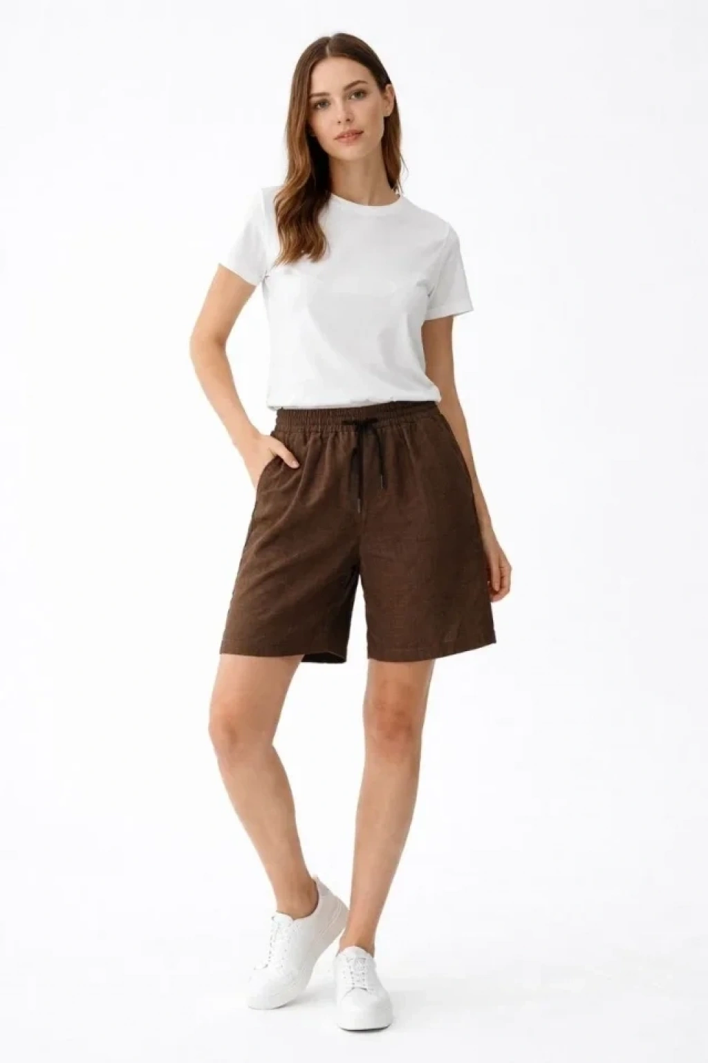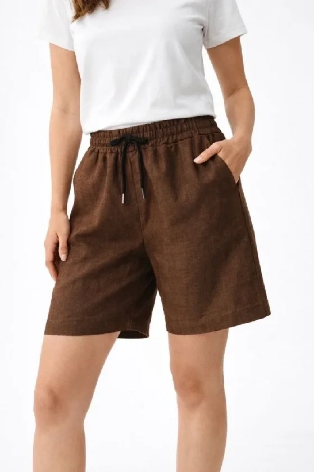 Keten Kumaş Cepli Rahat Kesim Bel astikli Şort Kahverengi
