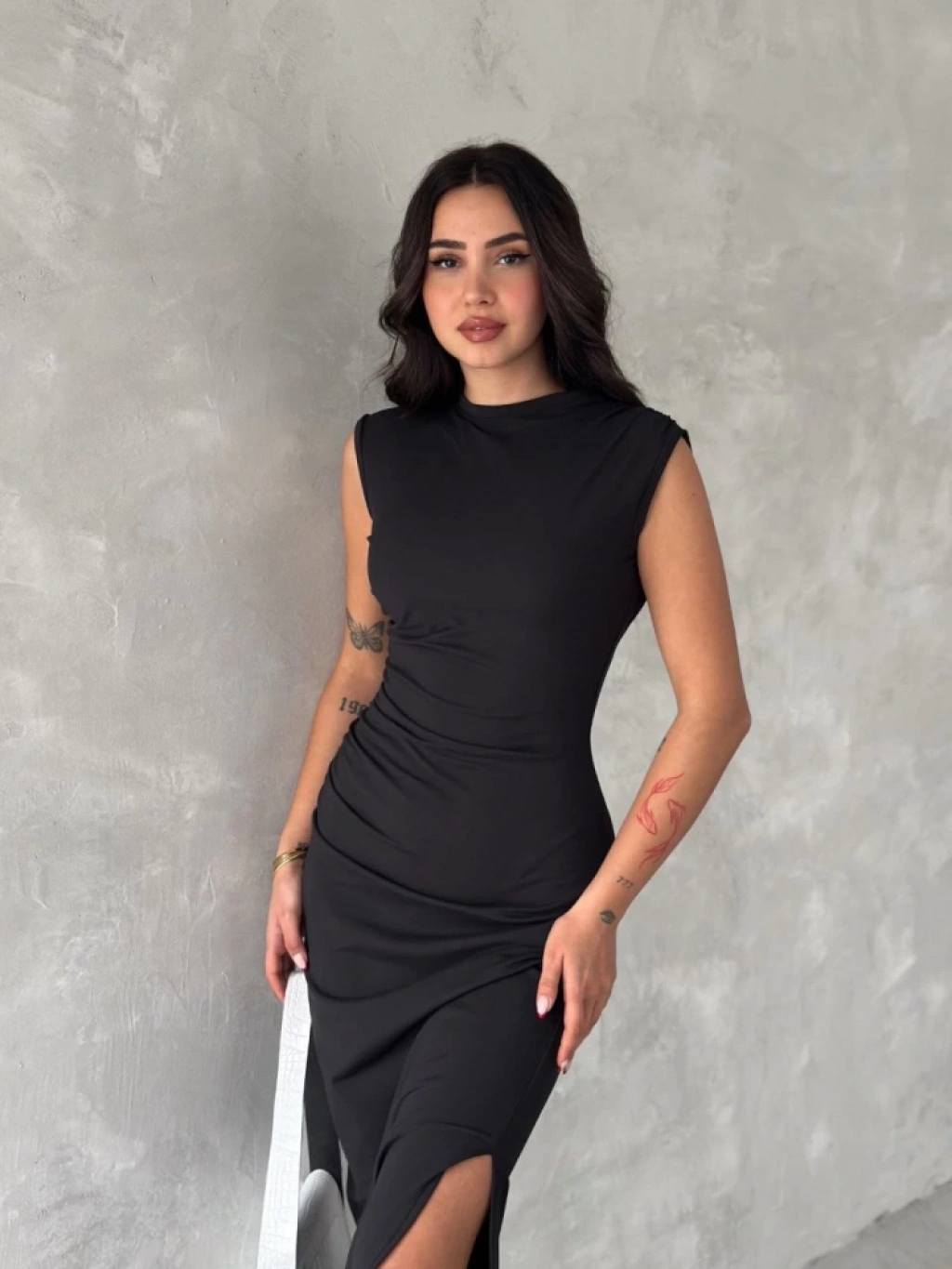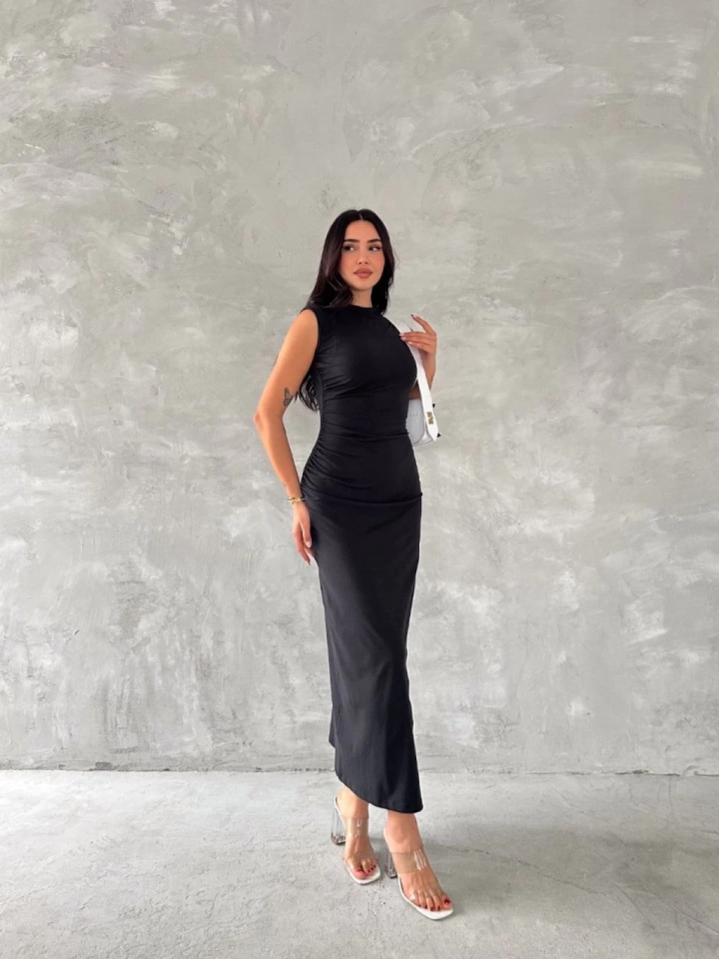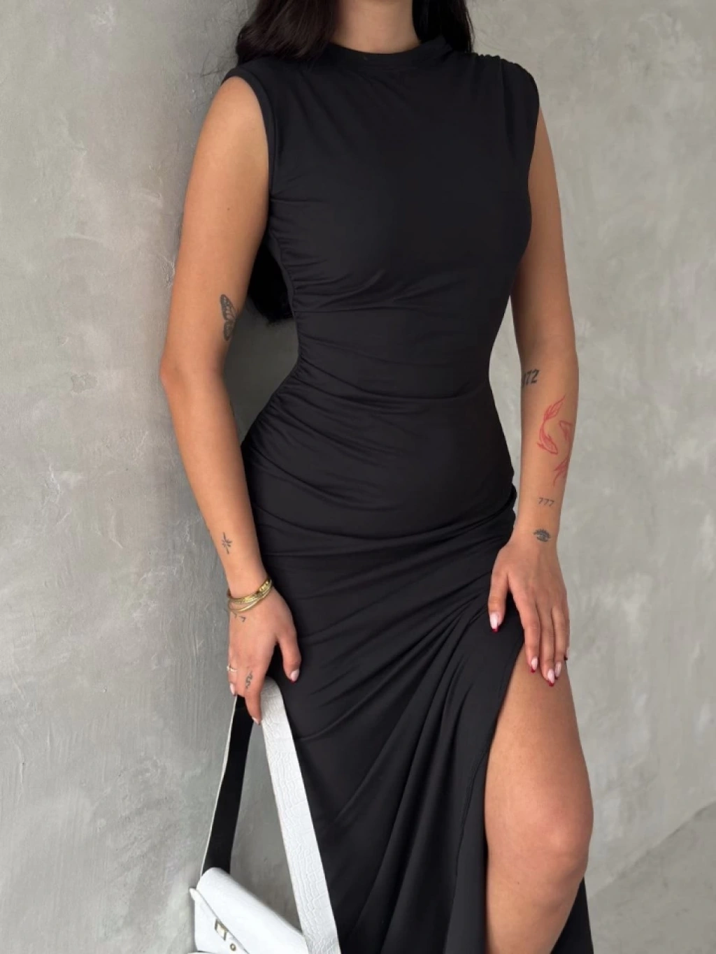 Kolsuz Yırtmaçlı Uzun Maxı Boy Elbise - Siyah