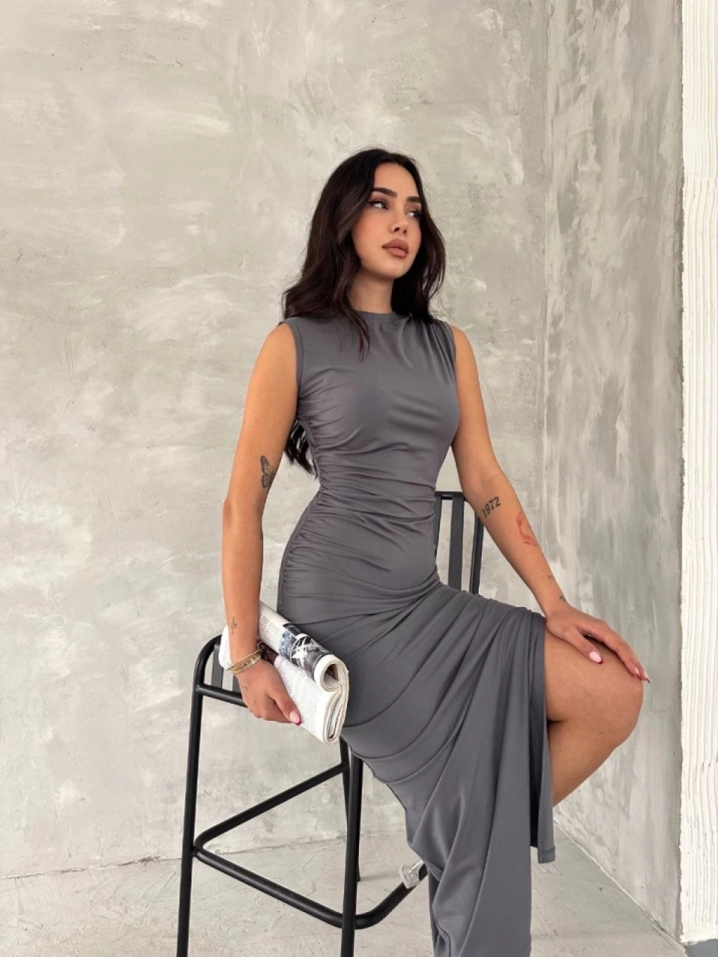 Kolsuz Yırtmaçlı Uzun Maxı Boy Elbise - Gri