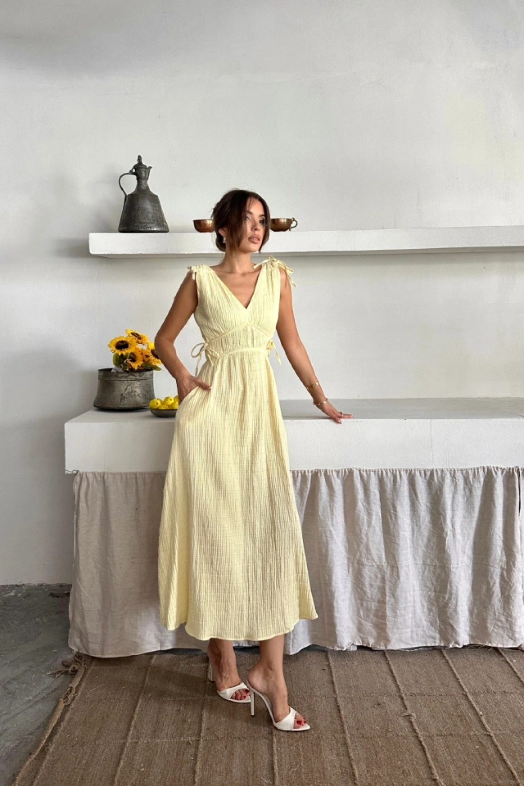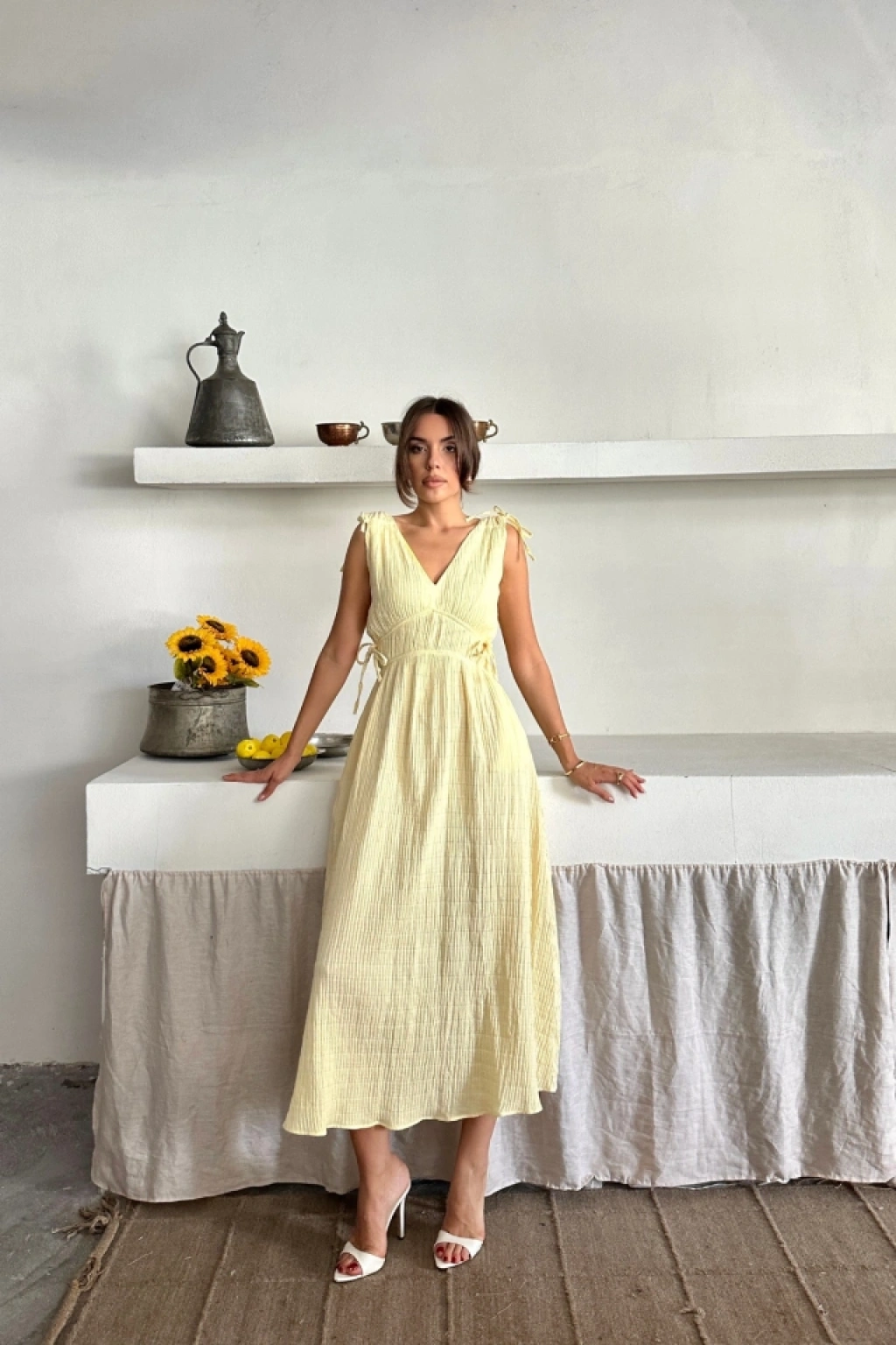 MÜSLİN ELBİSE OMUZ BÜZGÜ DETAYLI V YAKA KOLSUZ ELBİSE - Sarı
