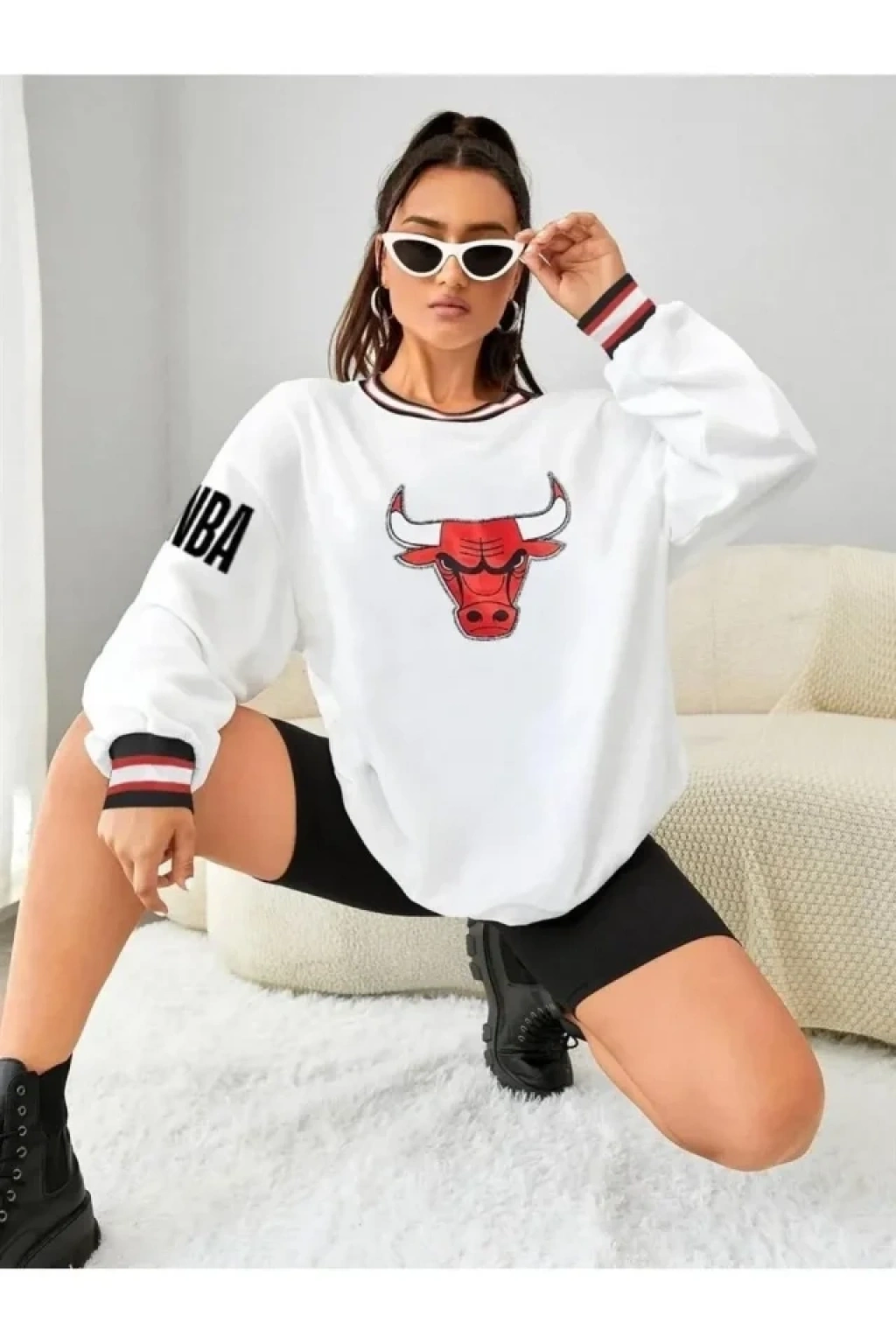 Nakışlı Oversize Sweatshirt - Beyaz