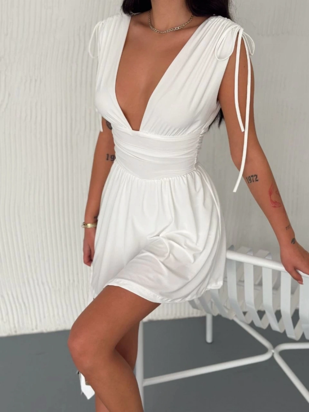 Omuzu Ip Askılı Şortlu Elbise - Beyaz