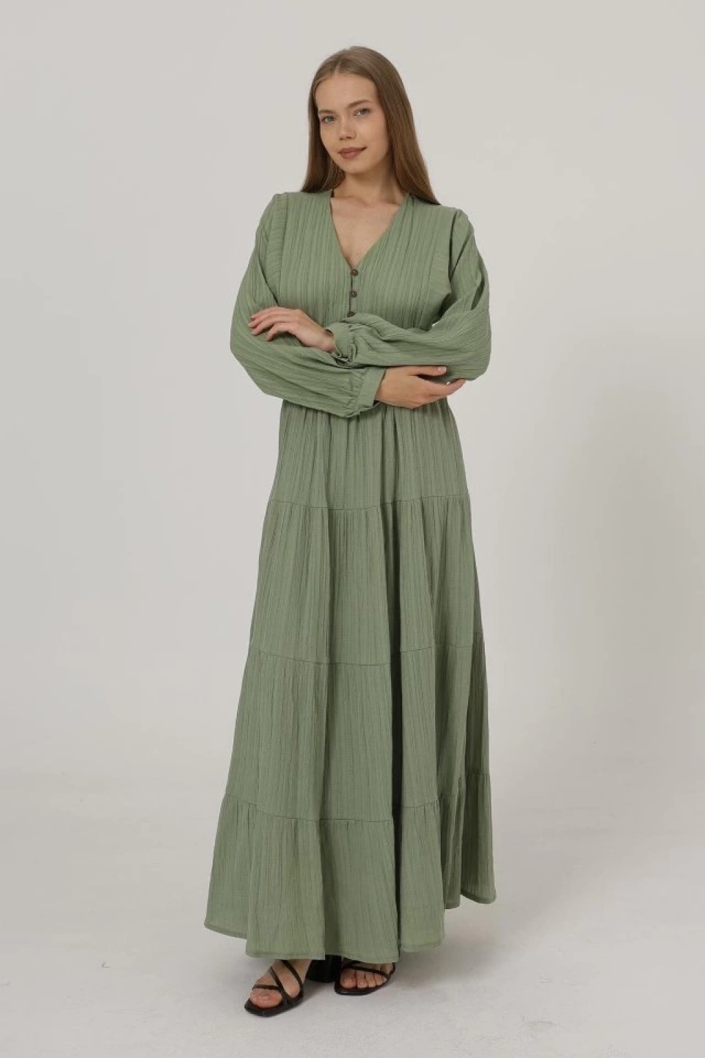 Önü Yarım Düğmeli Uzun Kol Kemerli Elbise - Haki