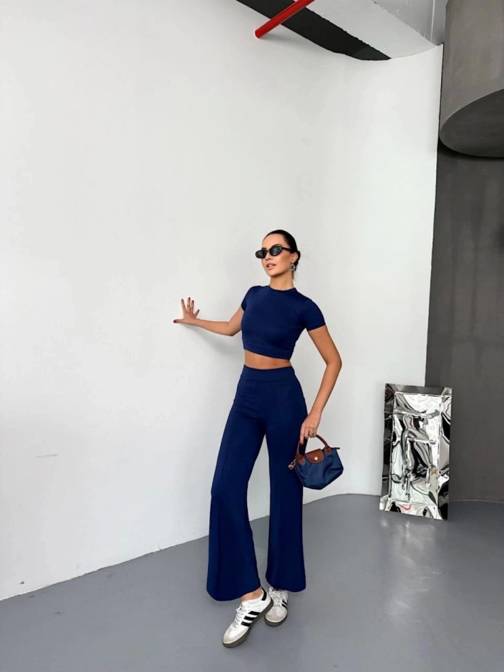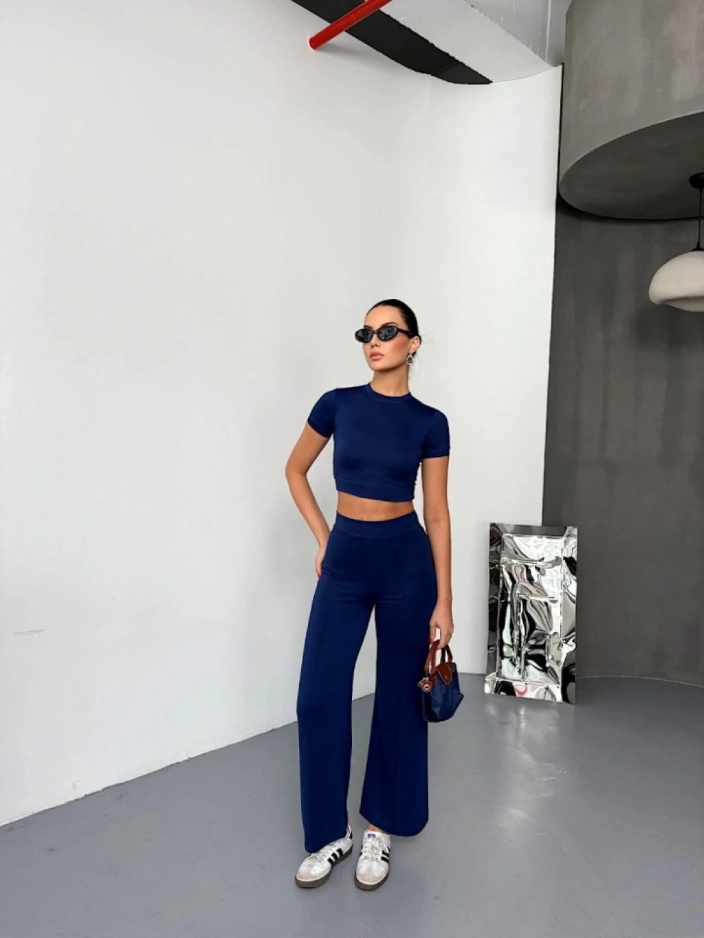 Osy Modal Yumuşak Dokulu Kumaş Kısa Kollu Crop Alt Ispanyol Paça Pantalon Ikili Takım - Lacivert