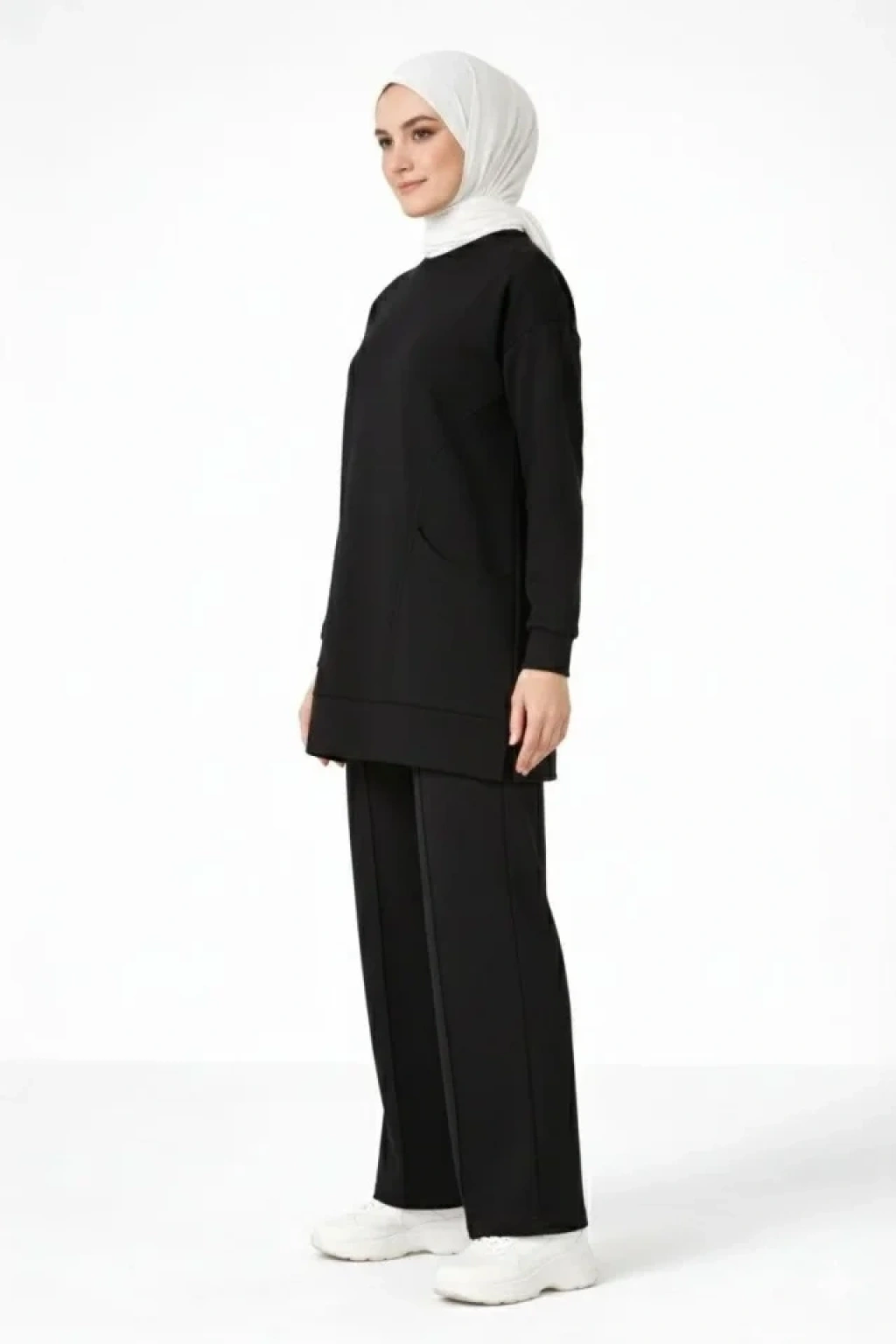 Osy Modal Yumuşak Dokulu Kumaş Tesettür Cepli Tunik Pantolon Takım - Siyah