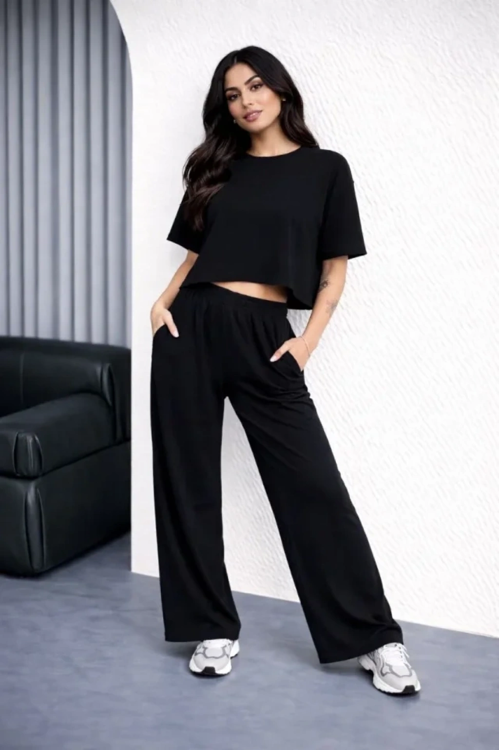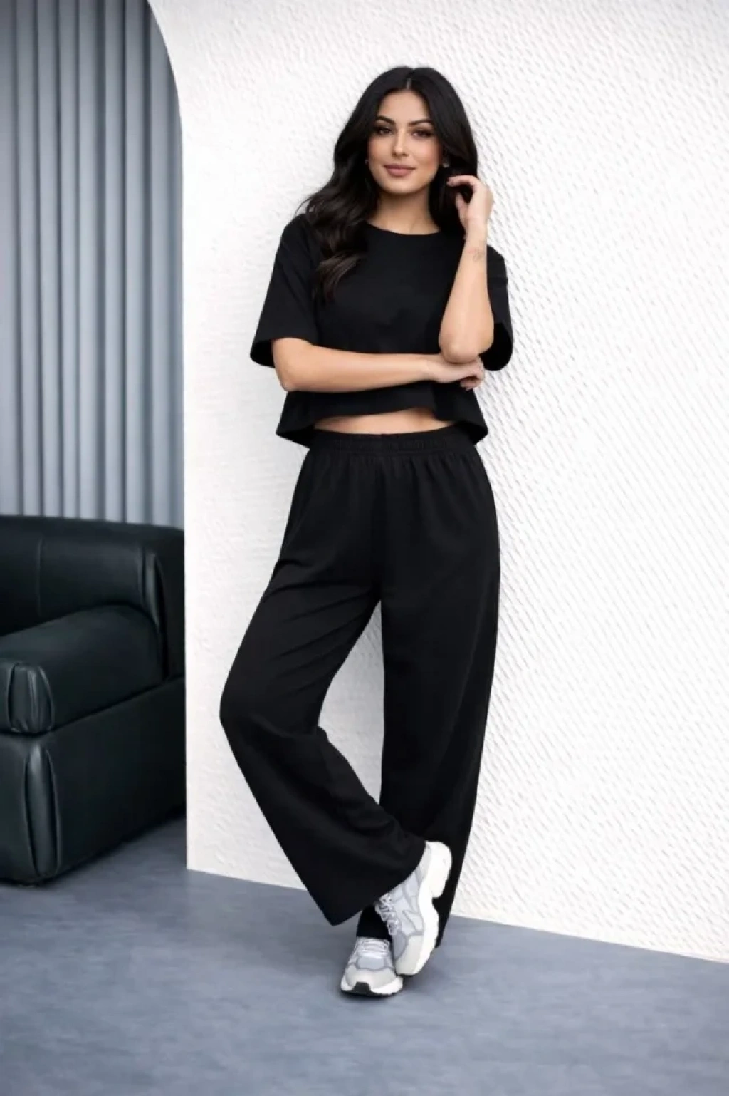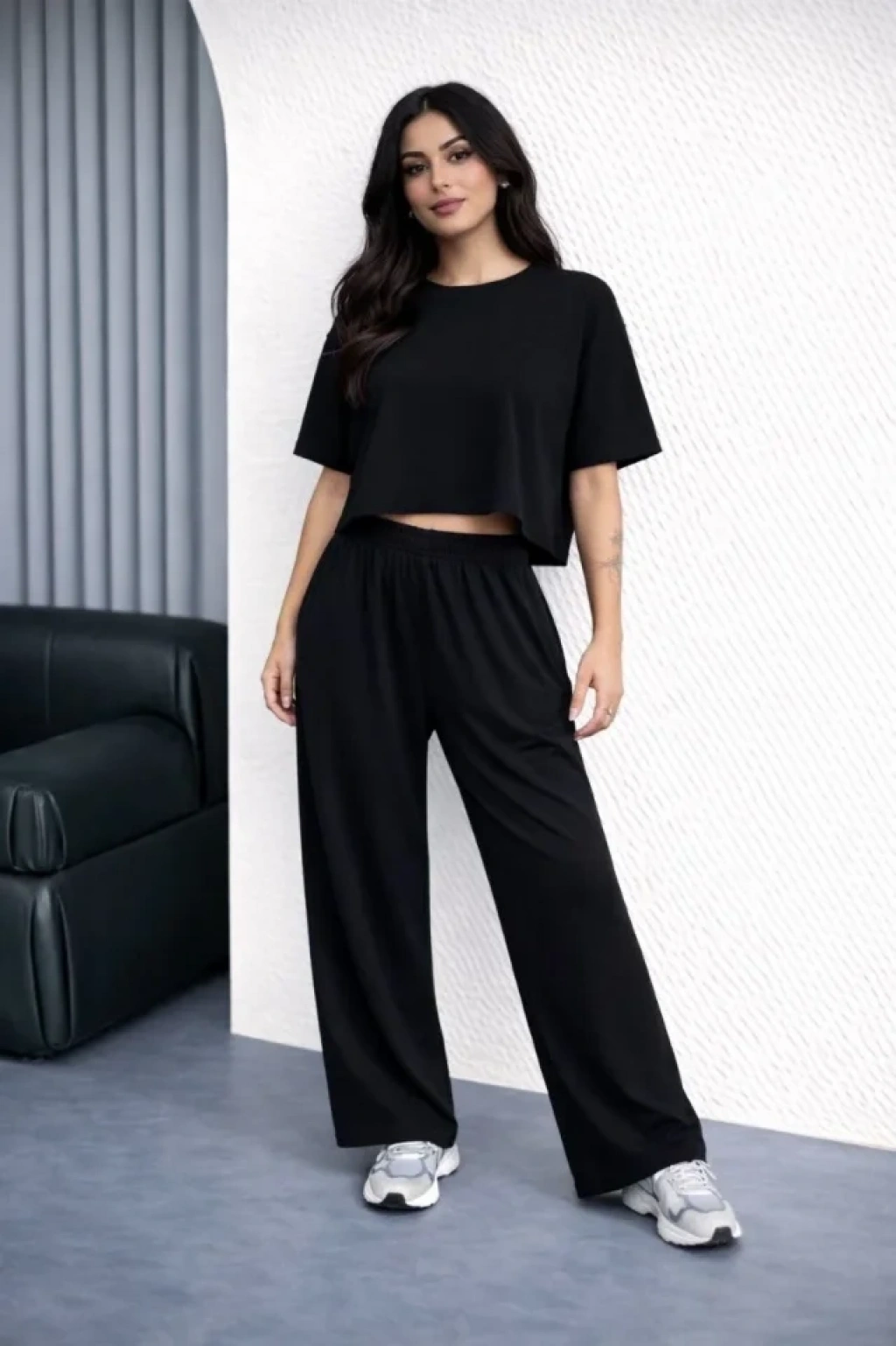 Osy Modal Yumuşak Dokulu Şalaş Oversize İkili Takım Bol Paça Pantolonlu Rahat Günlük Takım - Siyah