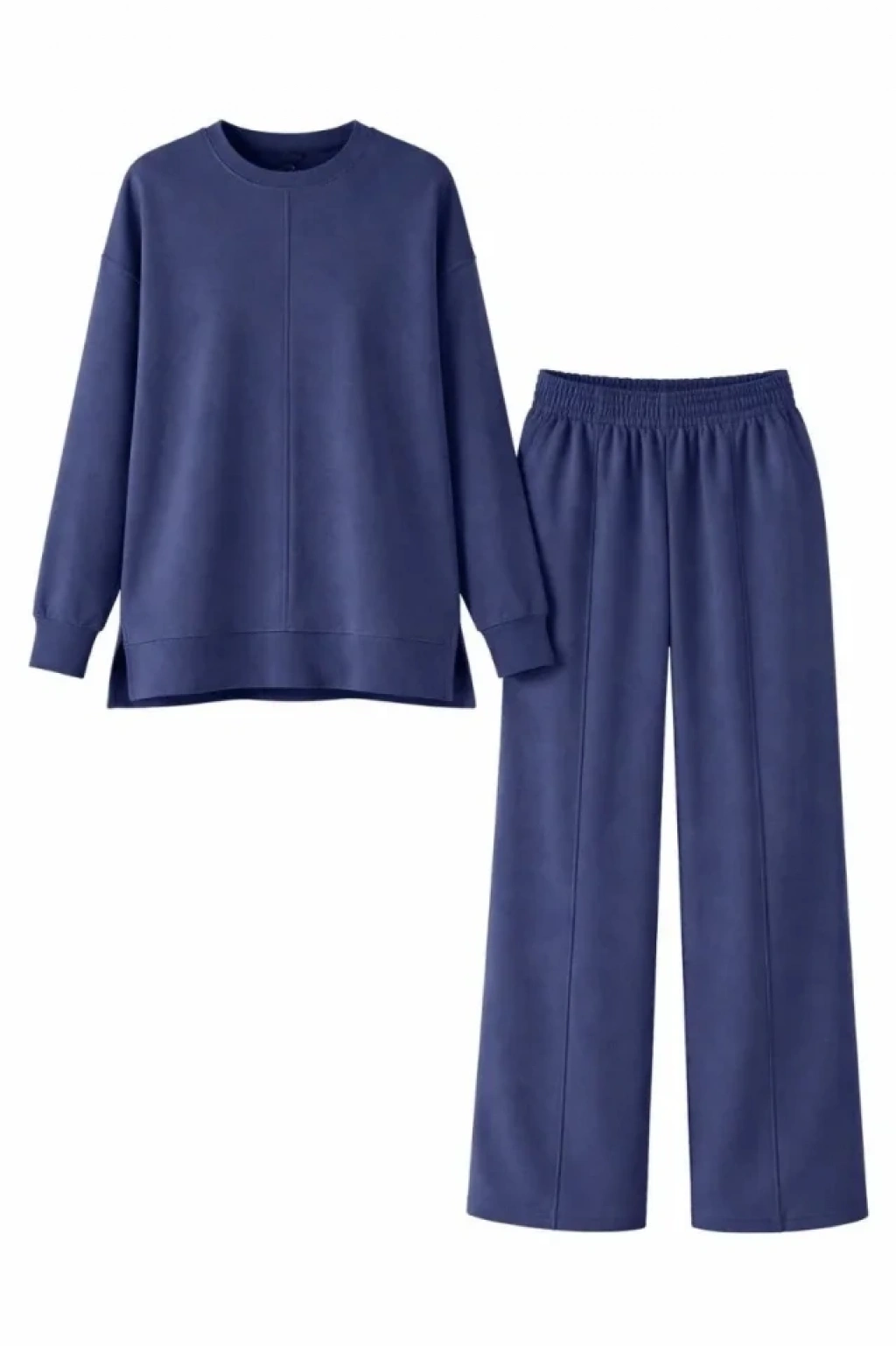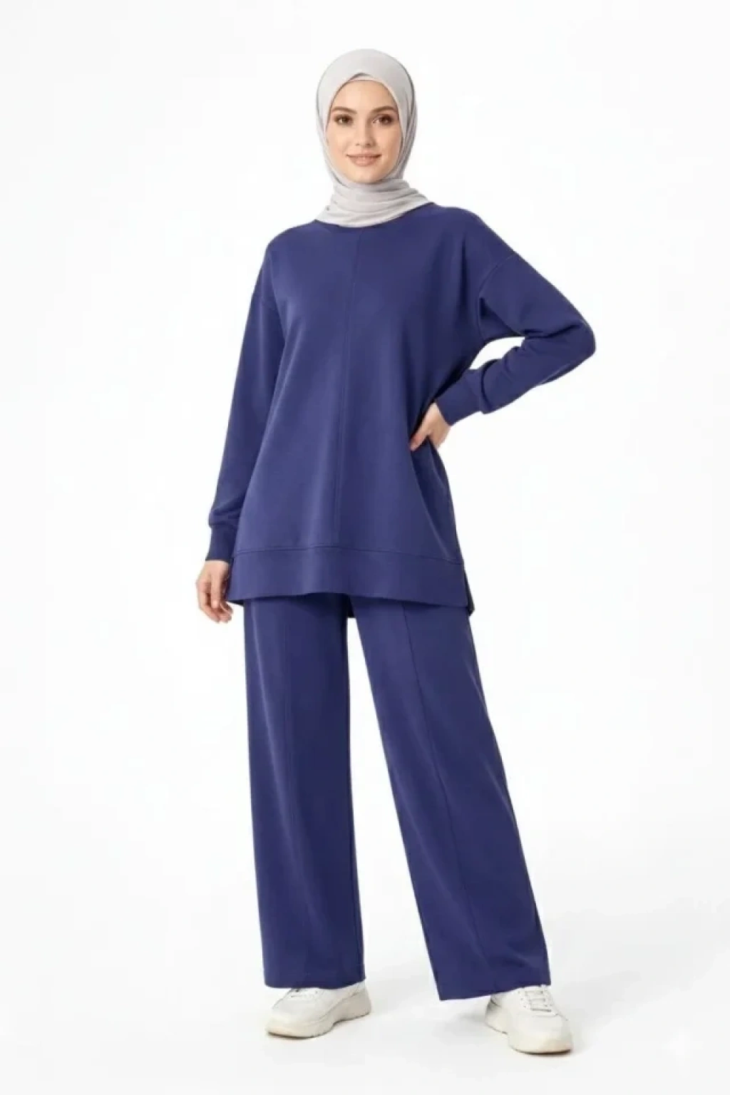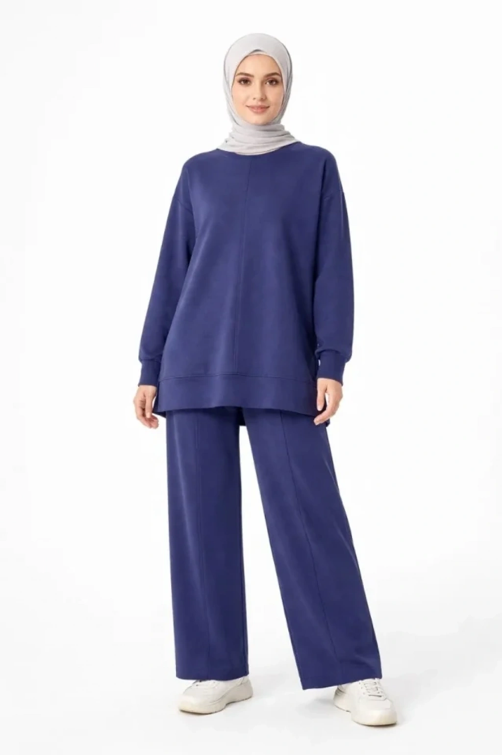Osy Modal Yumuşak Dokulu Tesettür İkili Takım Yan Yırtmaçlı Uzun Tunik Ve Düz Paça Pantolon, Salaş Kalıp - Lacivert