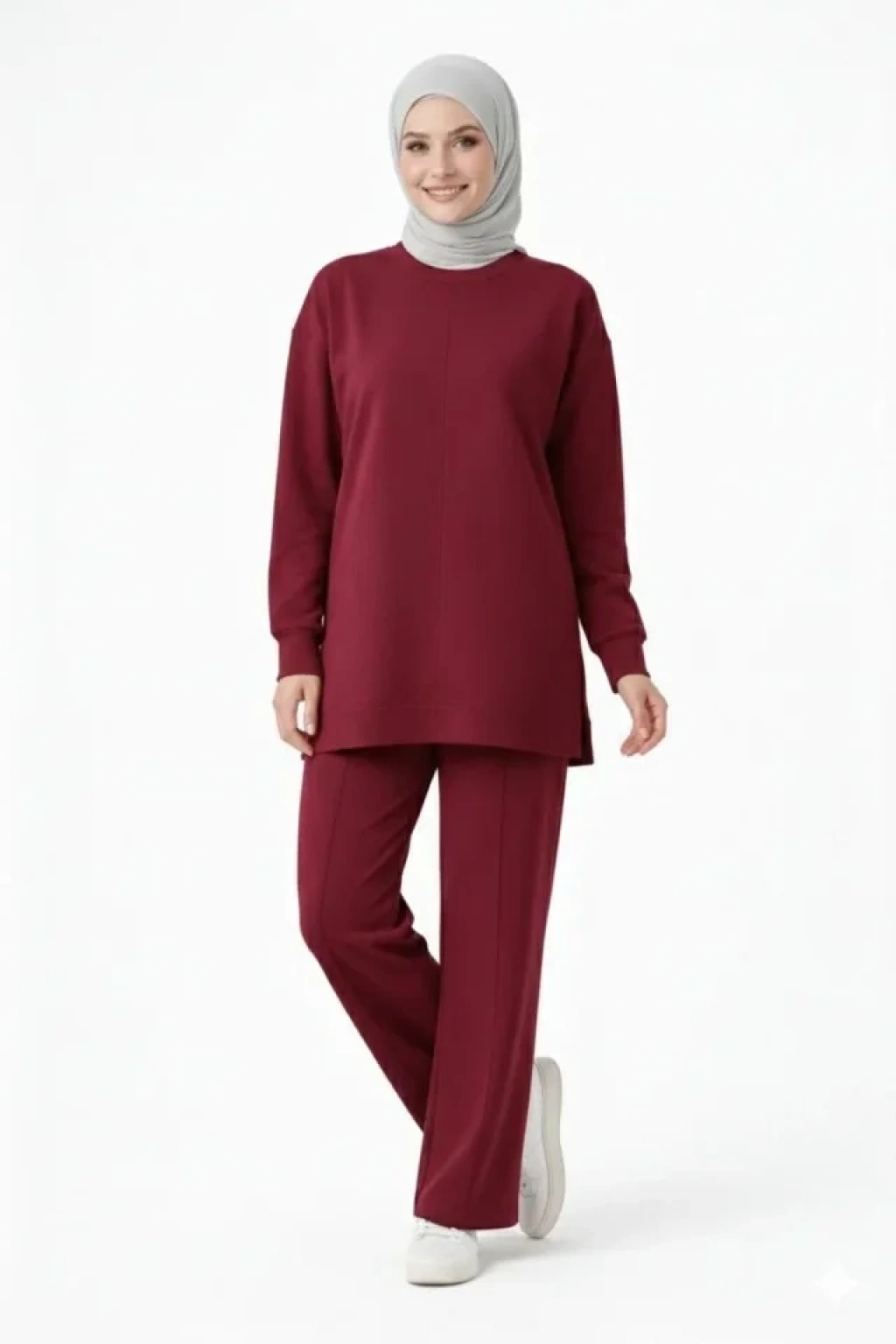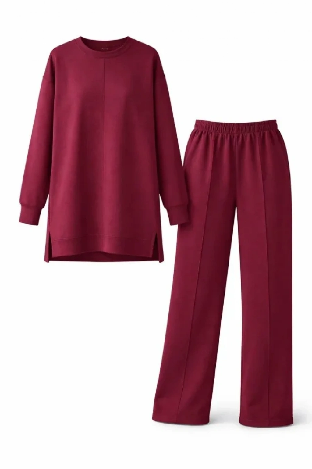 Osy Modal Yumuşak Dokulu Tesettür İkili Takım Yan Yırtmaçlı Uzun Tunik Ve Düz Paça Pantolon, Salaş Kalıp - Bordo