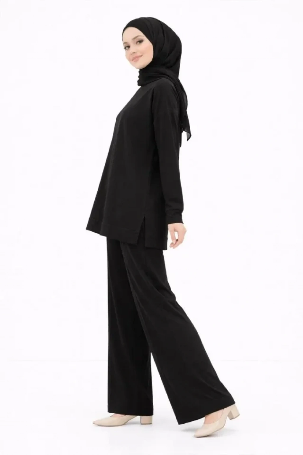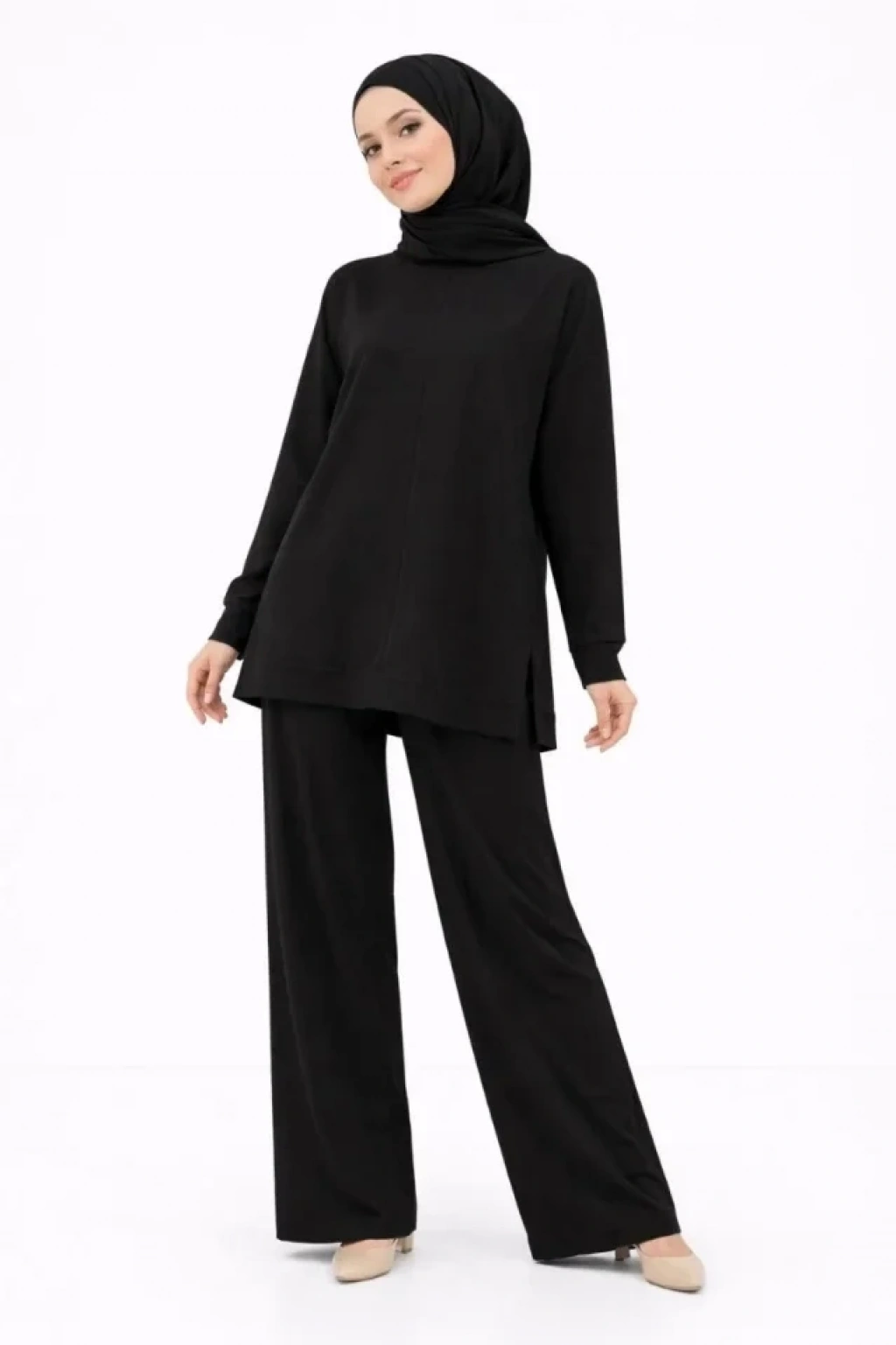 Osy Modal Yumuşak Dokulu Tesettür İkili Takım Yan Yırtmaçlı Uzun Tunik Ve Düz Paça Pantolon, Salaş Kalıp - Siyah