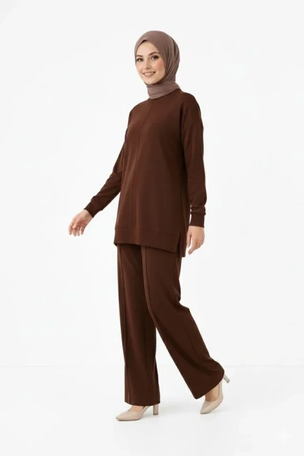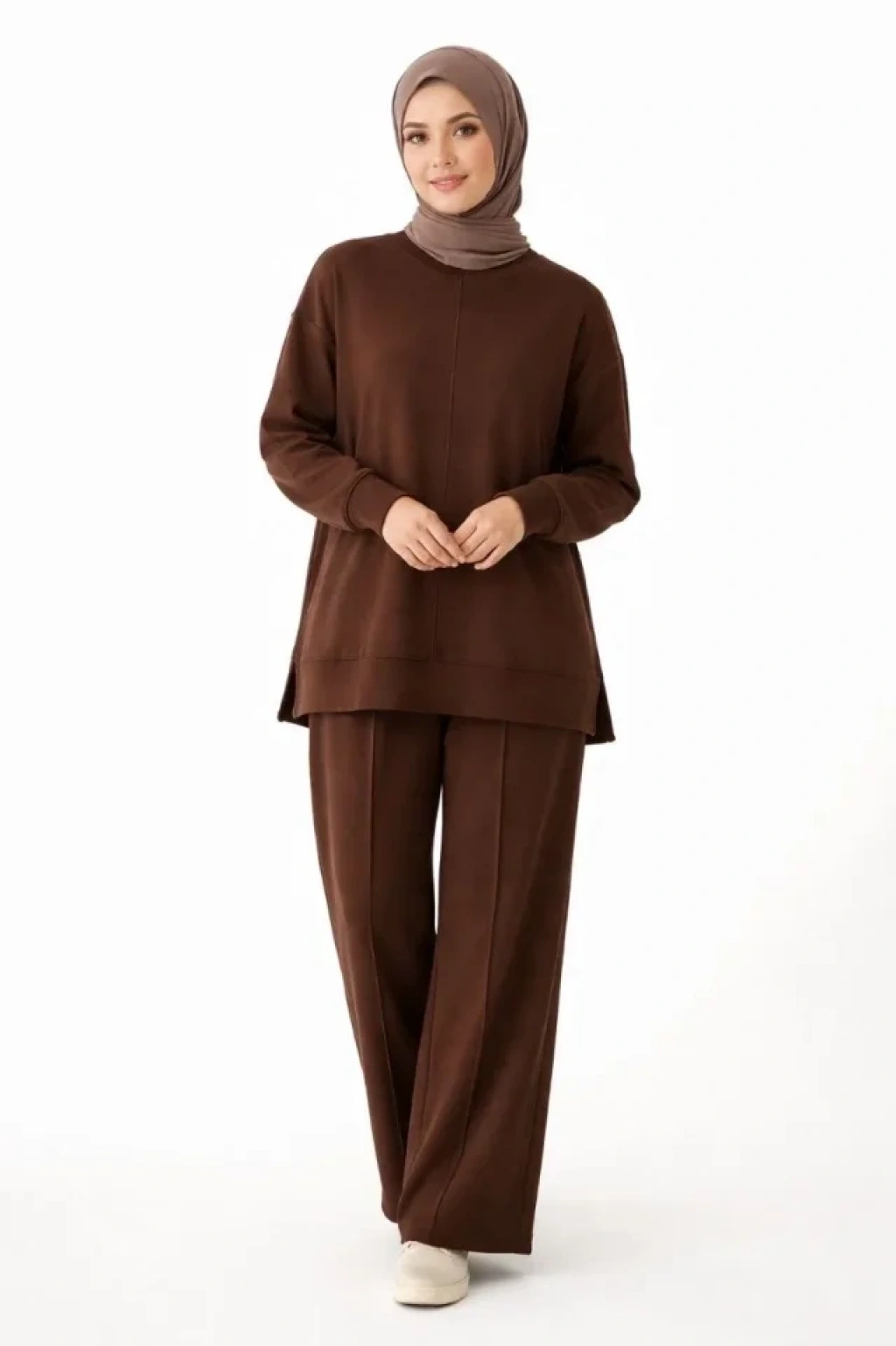 Osy Modal Yumuşak Dokulu Tesettür İkili Takım Yan Yırtmaçlı Uzun Tunik Ve Düz Paça Pantolon, Salaş Kalıp - Kahverengi