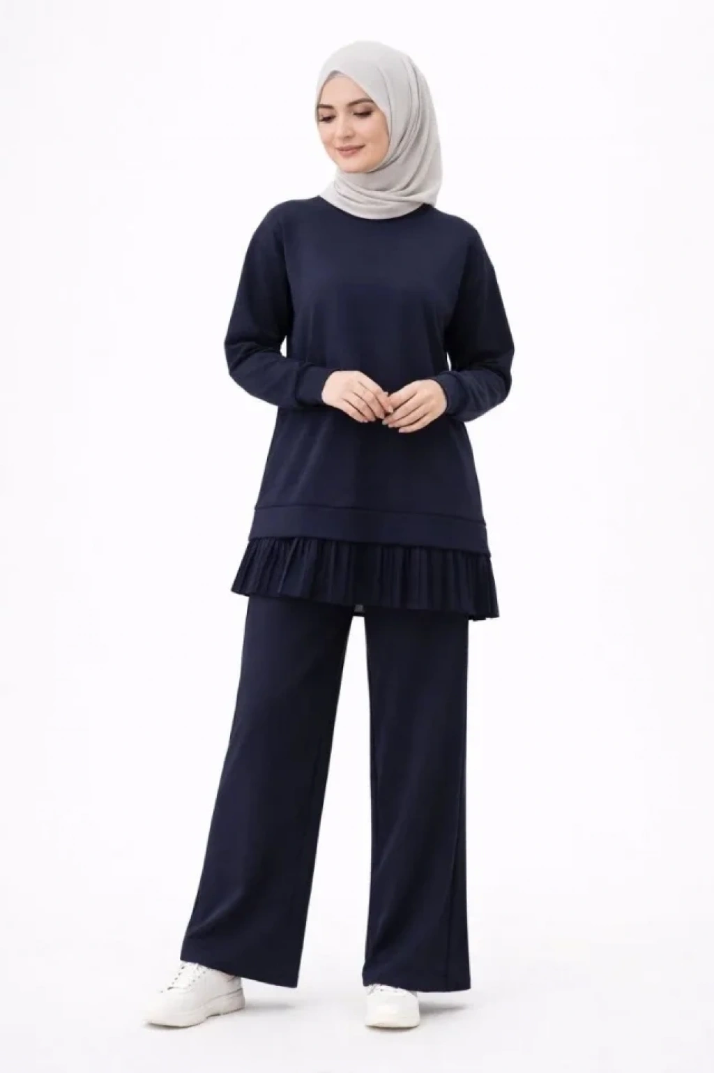 Osy Modal Yumuşak Dokulu Tesettür Pliseli Takım Uzun Tunik Pantolon İkili Kombin - Lacivert