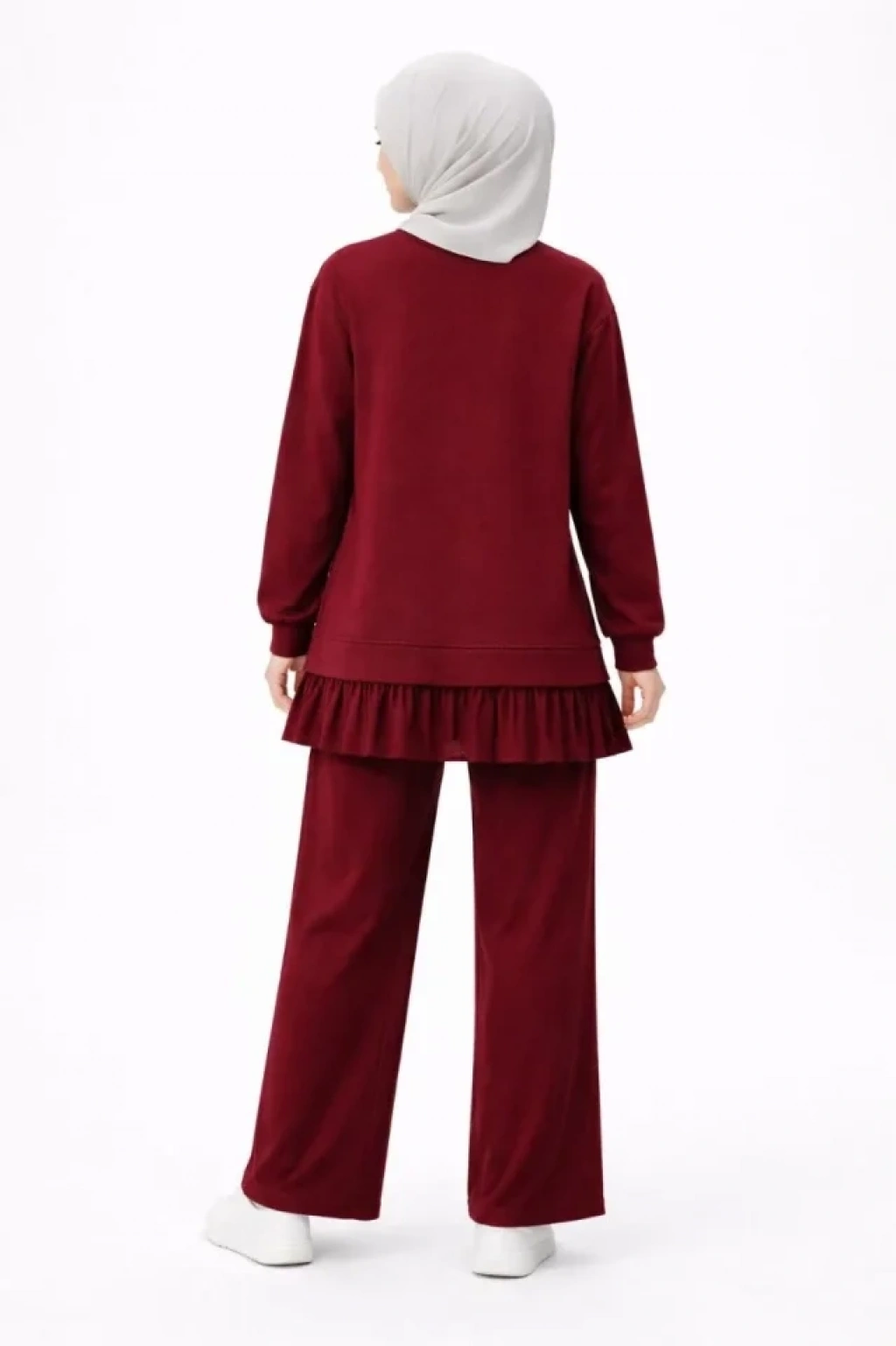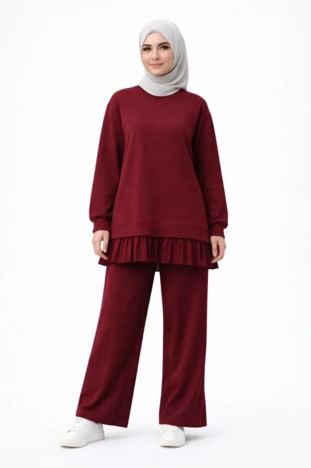 Osy Modal Yumuşak Dokulu Tesettür Pliseli Takım Uzun Tunik Pantolon İkili Kombin - Bordo