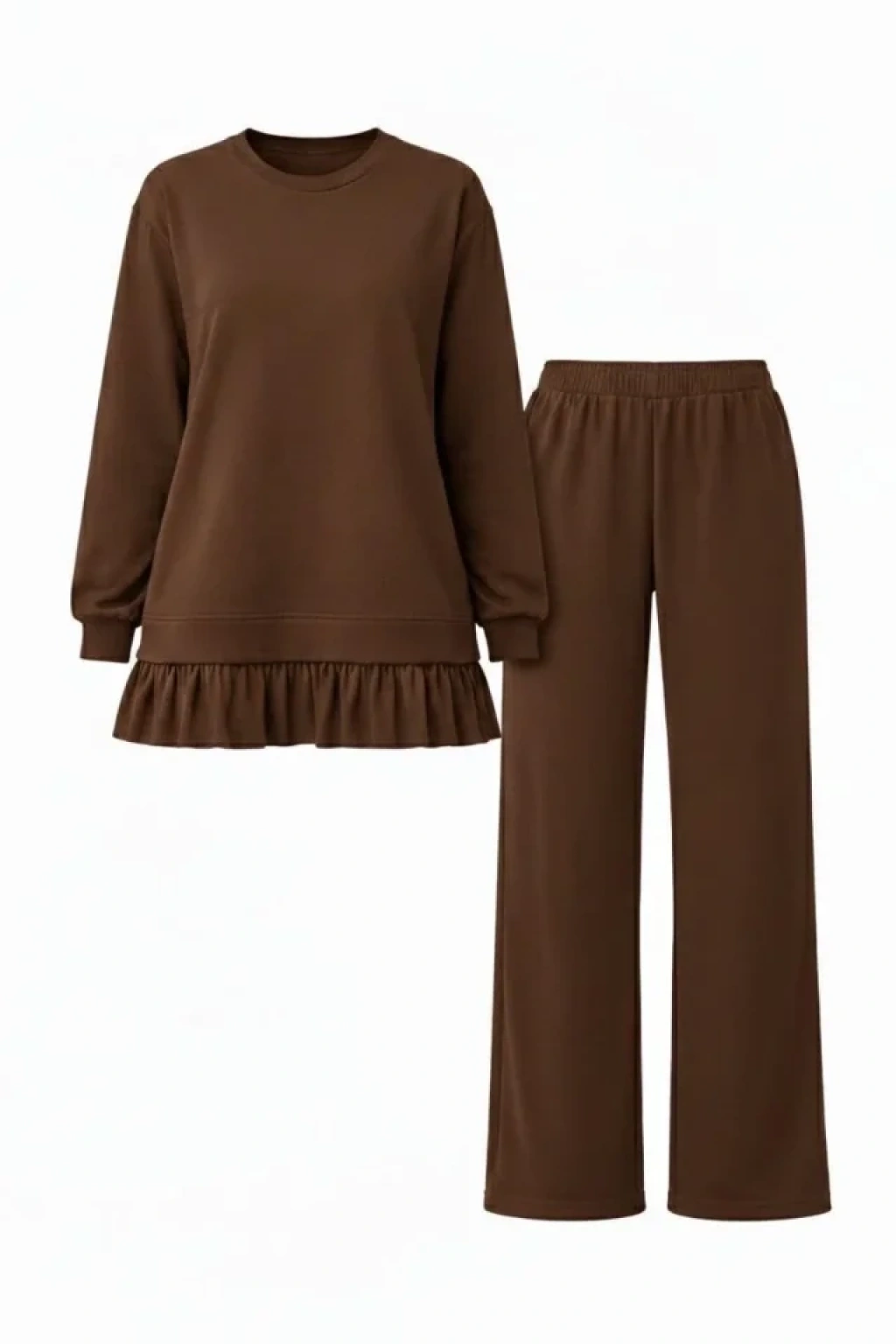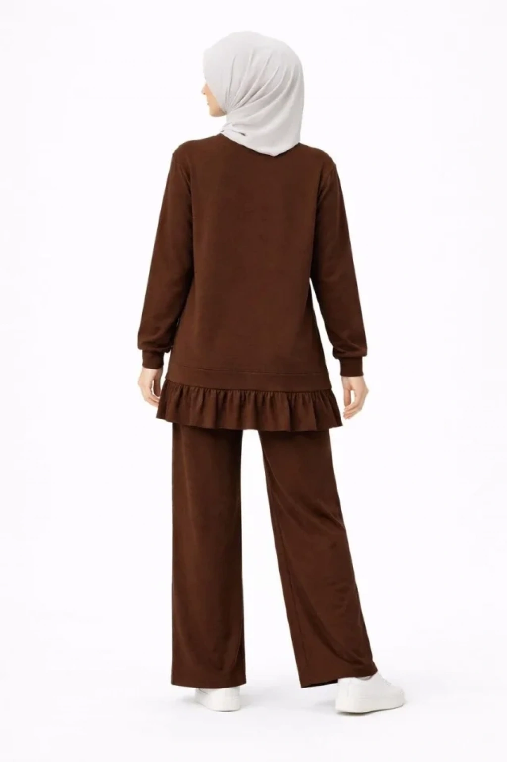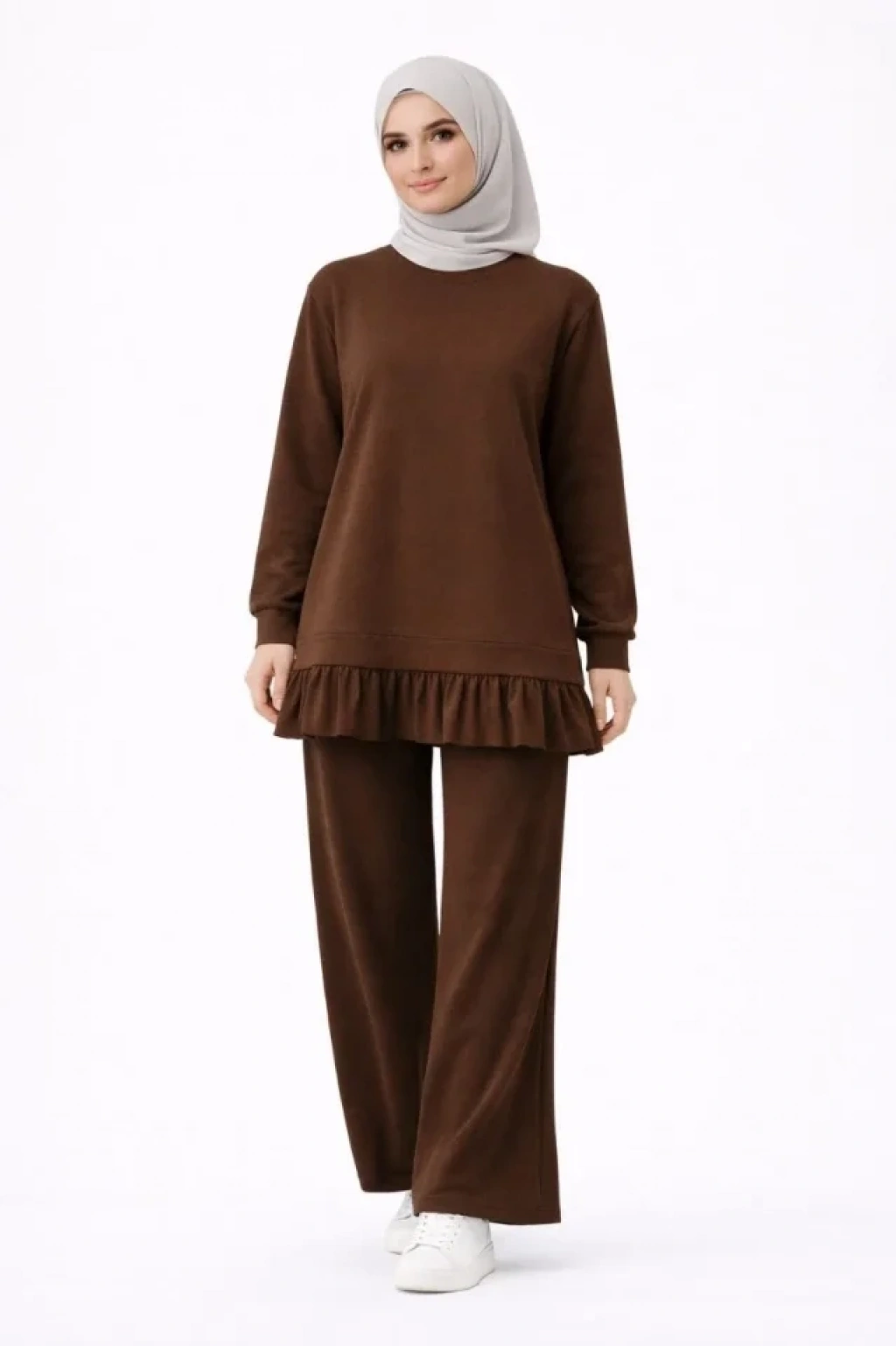 Osy Modal Yumuşak Dokulu Tesettür Pliseli Takım Uzun Tunik Pantolon İkili Kombin - Kahverengi