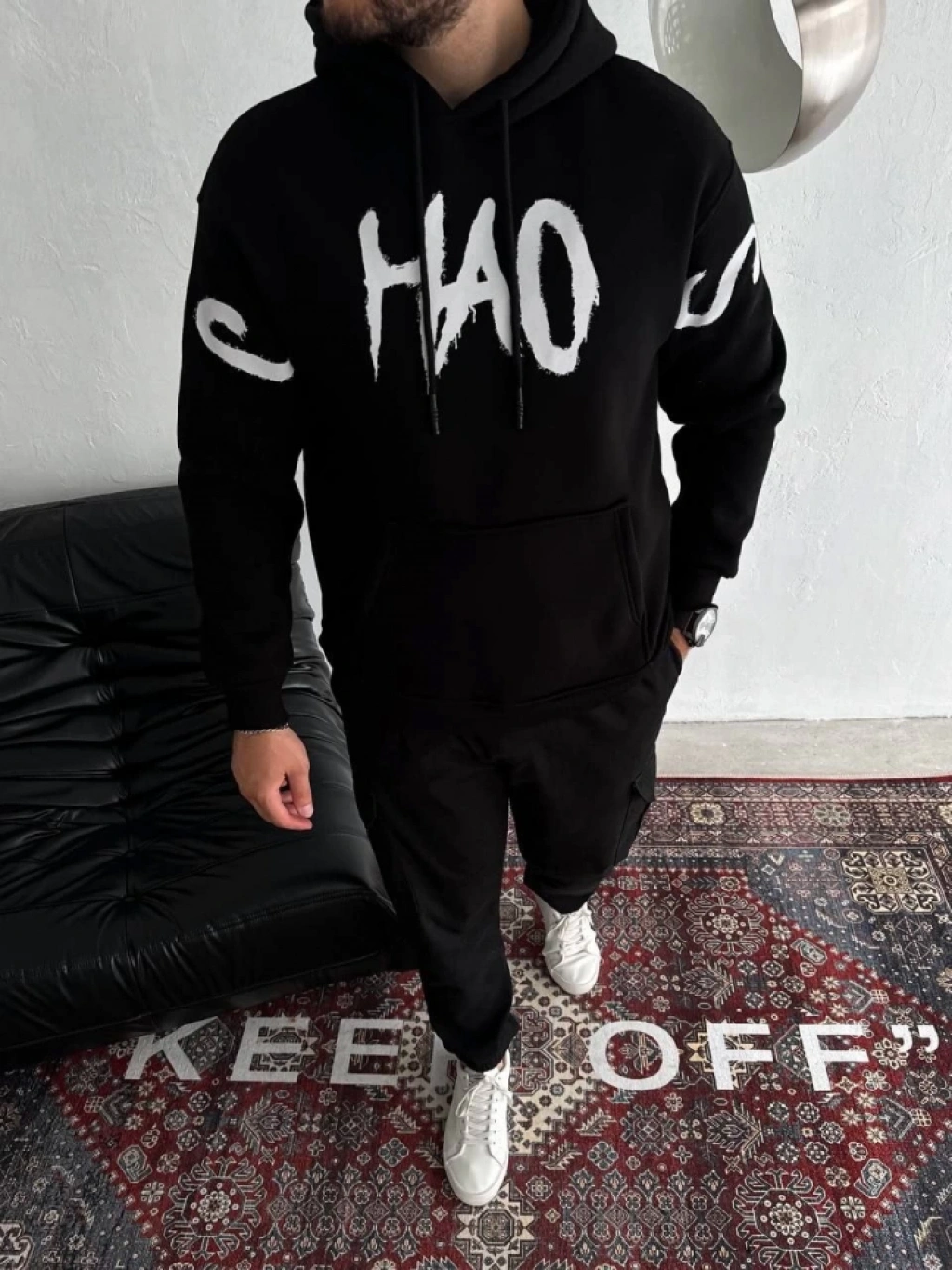 Oversize Kapşonlu Baskılı SweatShirt - Siyah