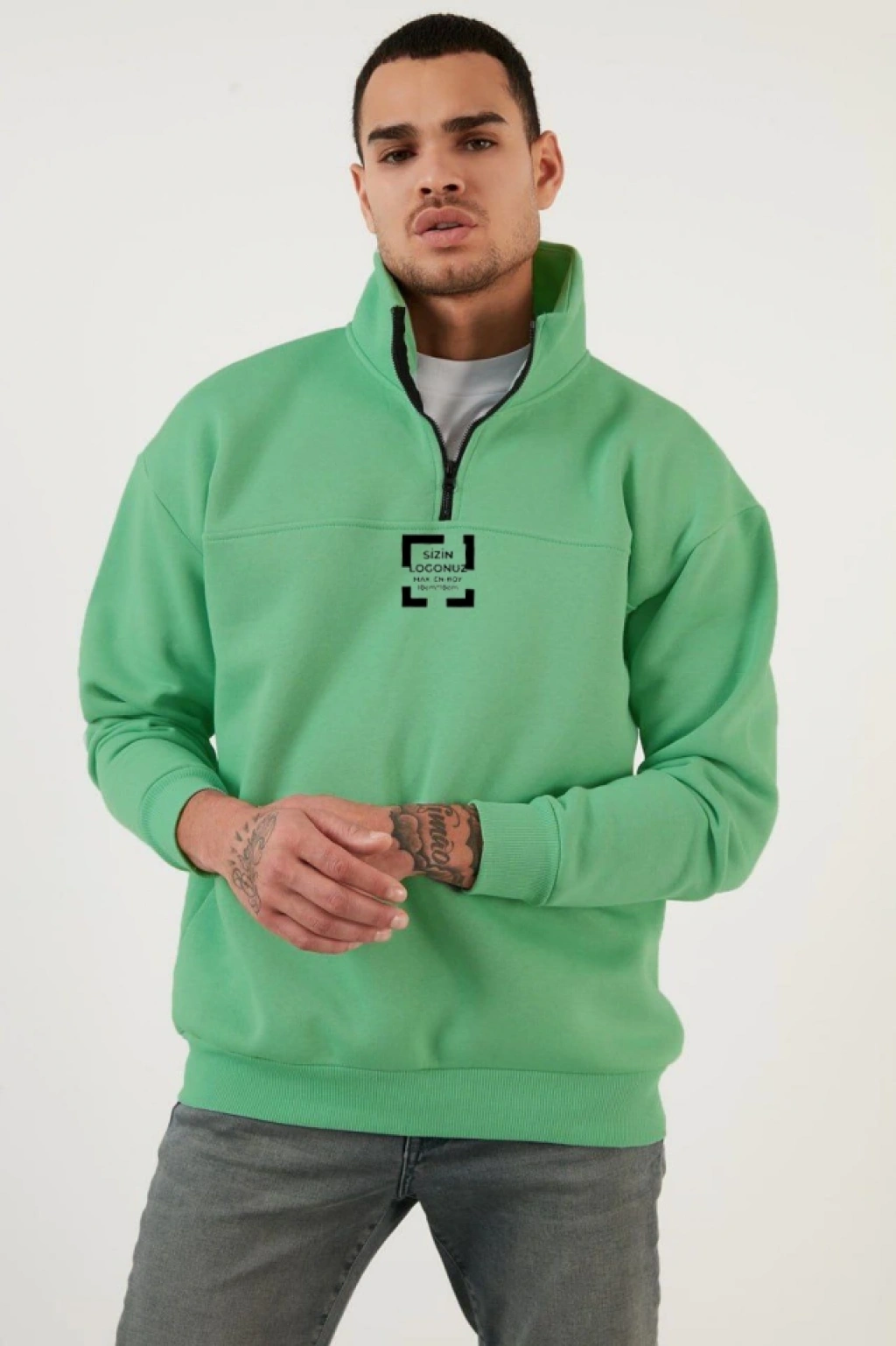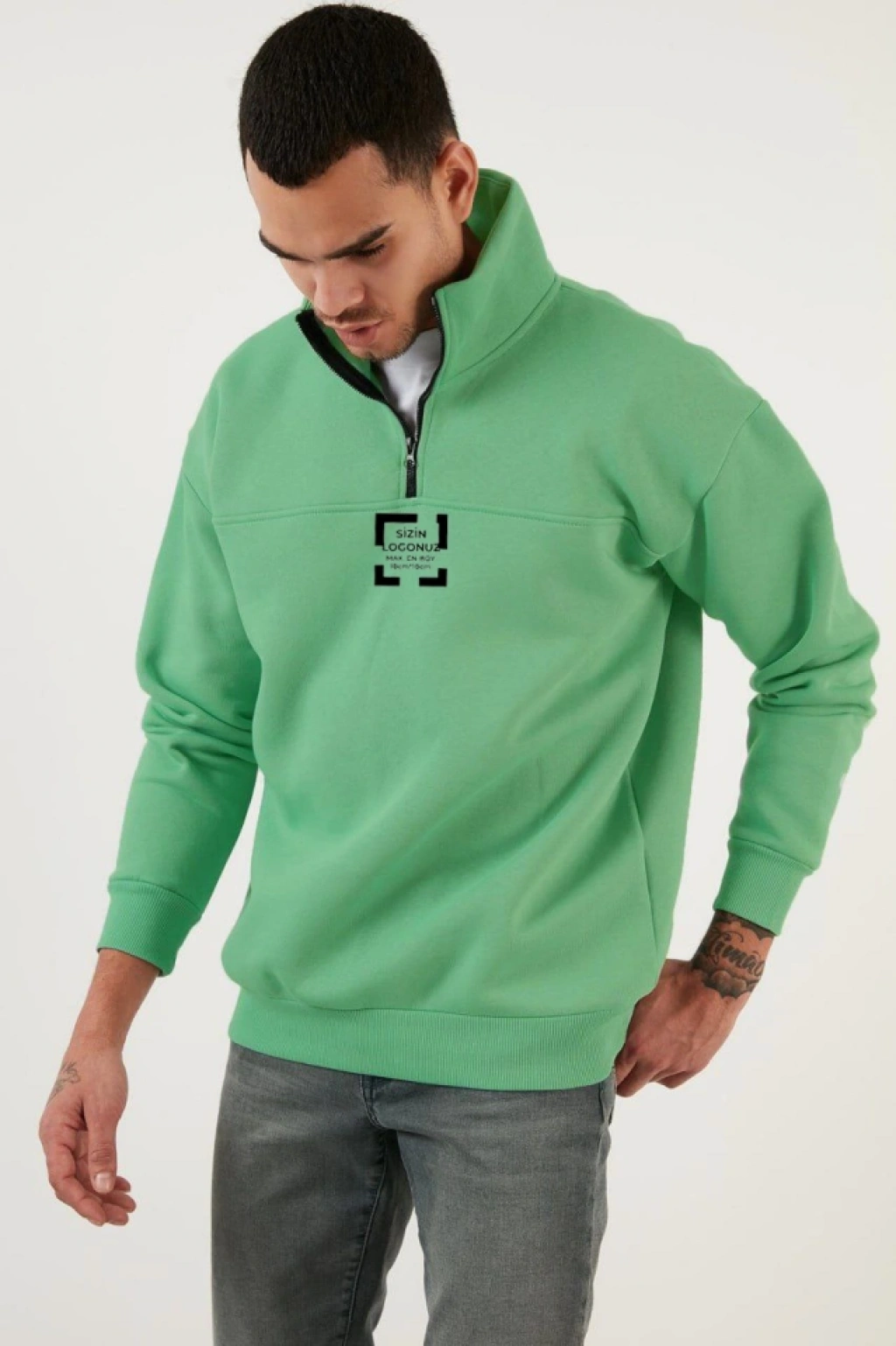 Oversize Yarım Farmuarlı Yakalı Özel Tasarım Basic SweatShirt - Açık Yeşil