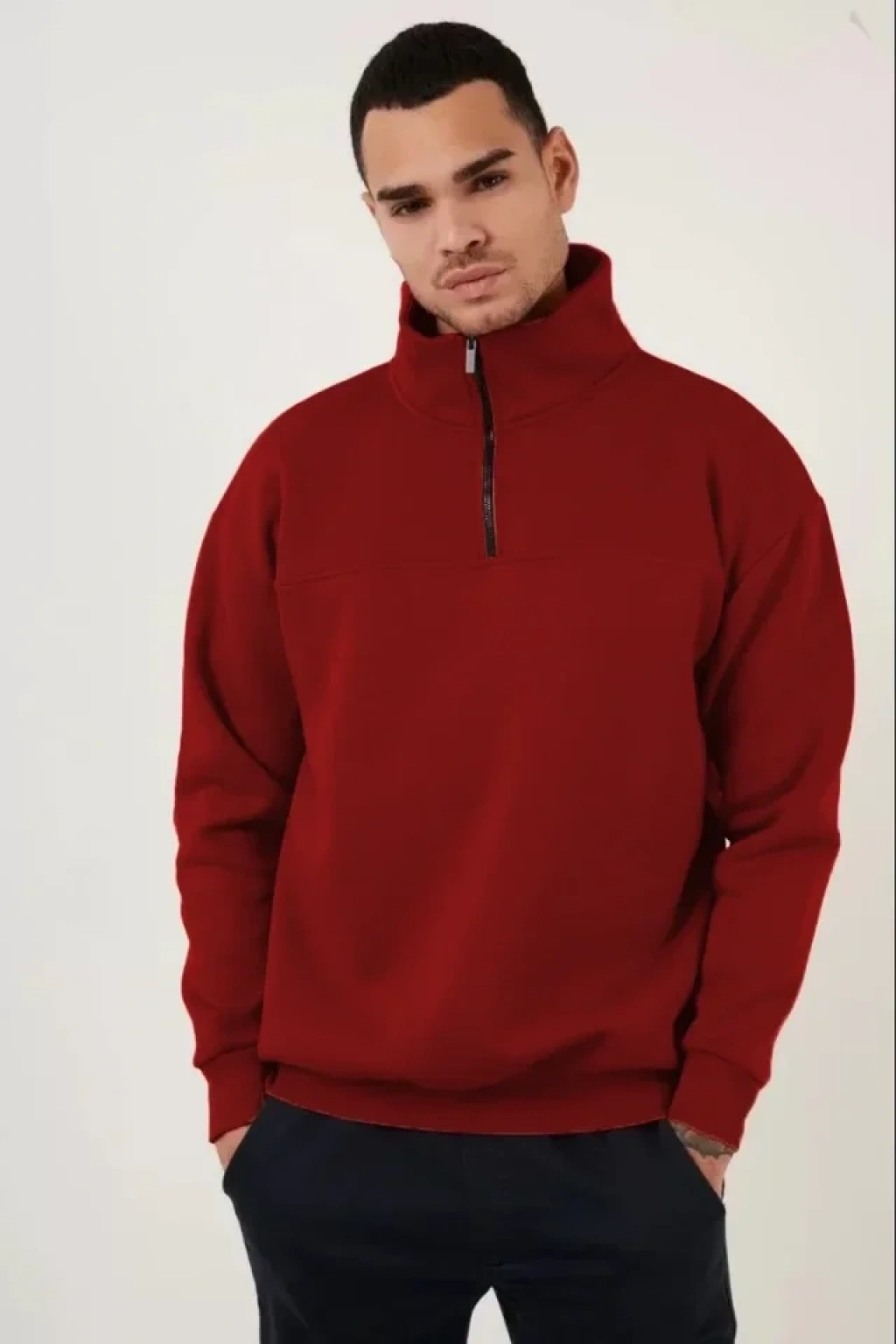 Oversize Yarım Farmuarlı Yakalı Özel Tasarım Basic weathirt Bordo
