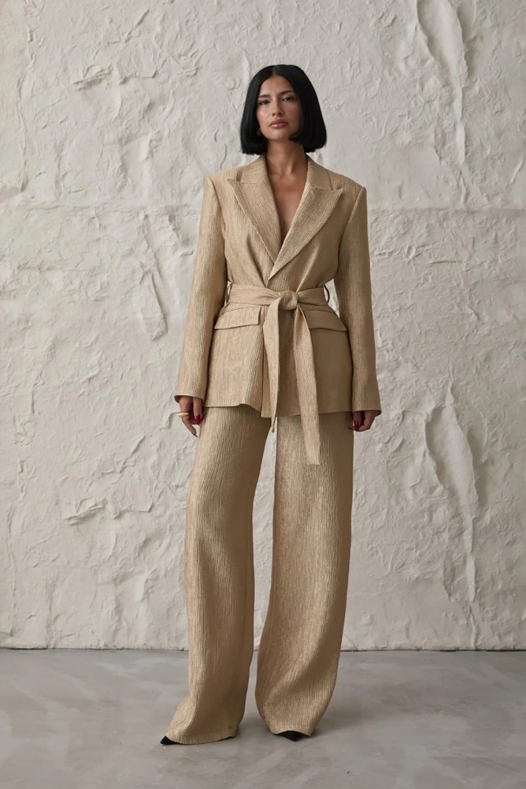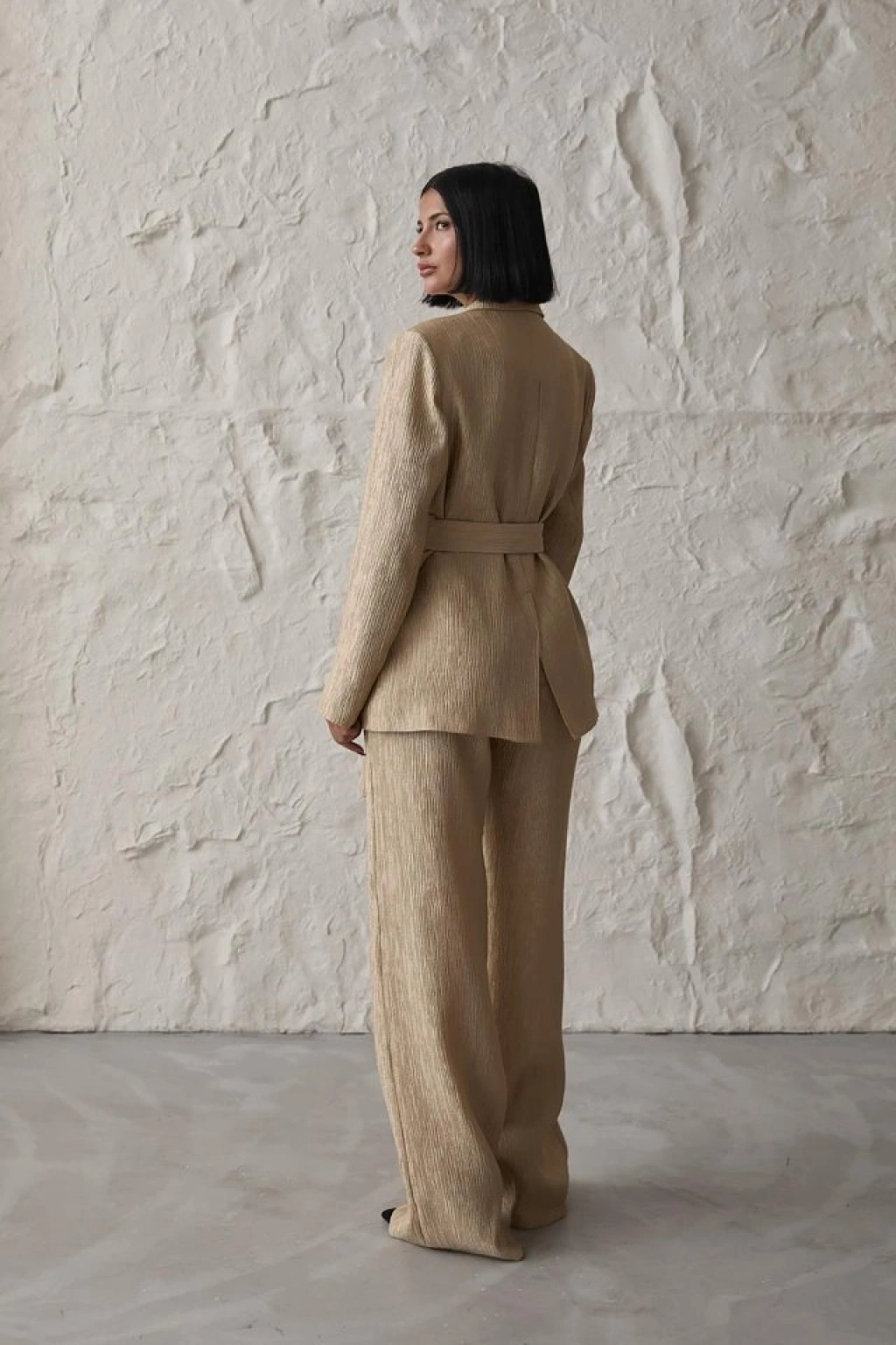 Sarı Beli Kuşaklı Ceket Ve Pantolon Parlak Takım