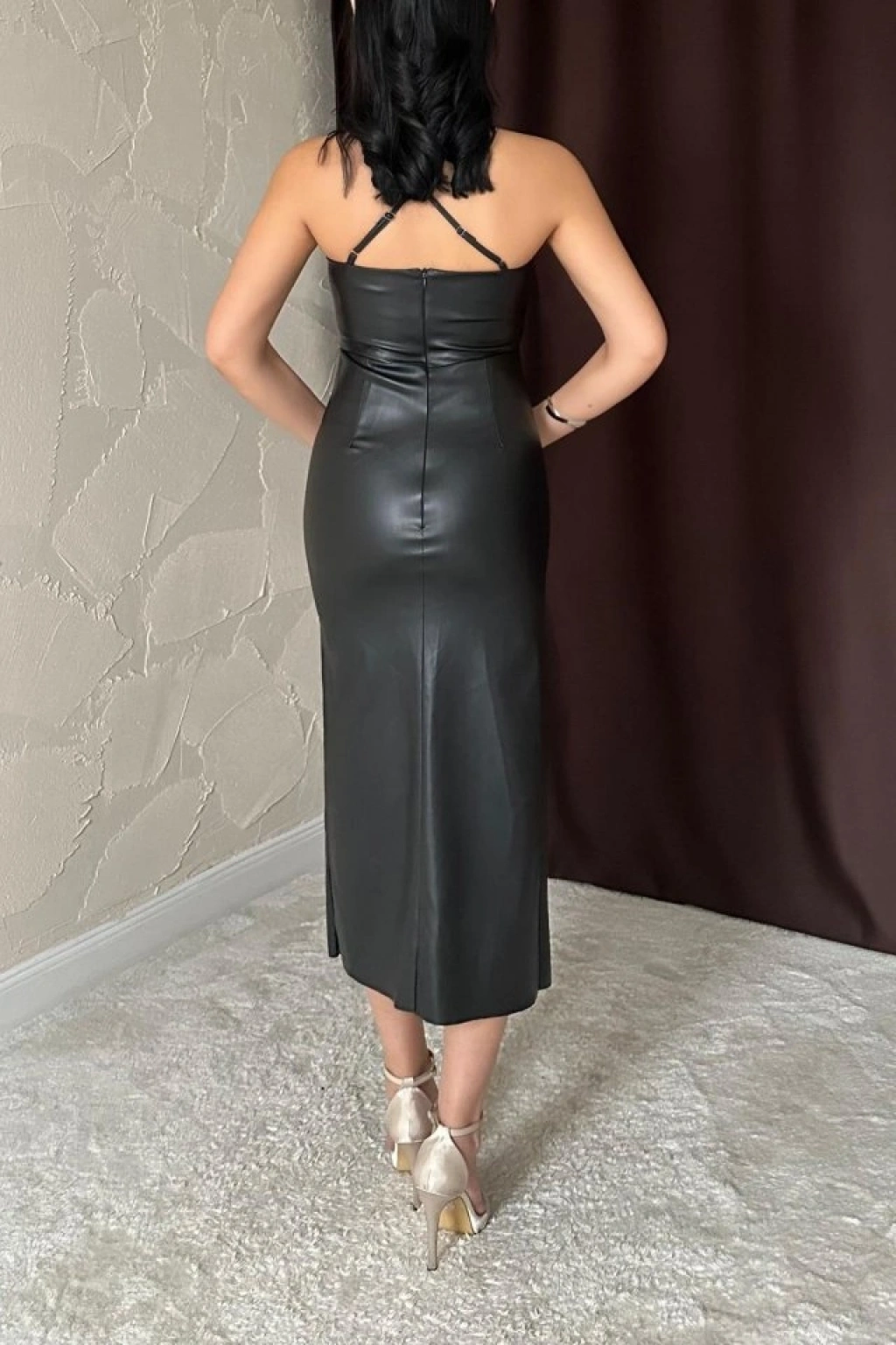 Siyah Sırt Dekolteli Deri Elbise