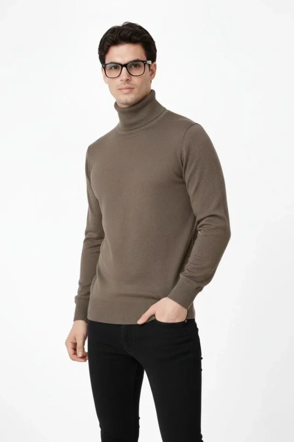 Tam Boğazlı Balıkcı Yaka Triko Kazak Yumuşak Dokulu Pamuklu Ince Dokuma, Uzun Kollu Rahat Regular Kalıp - Kahverengi