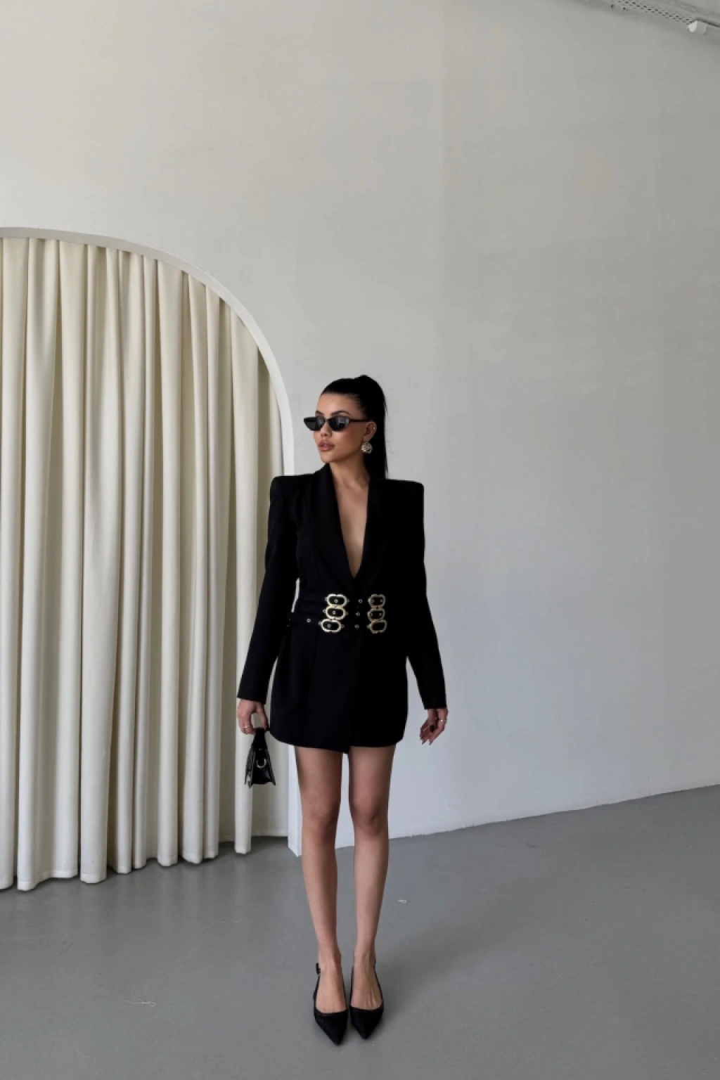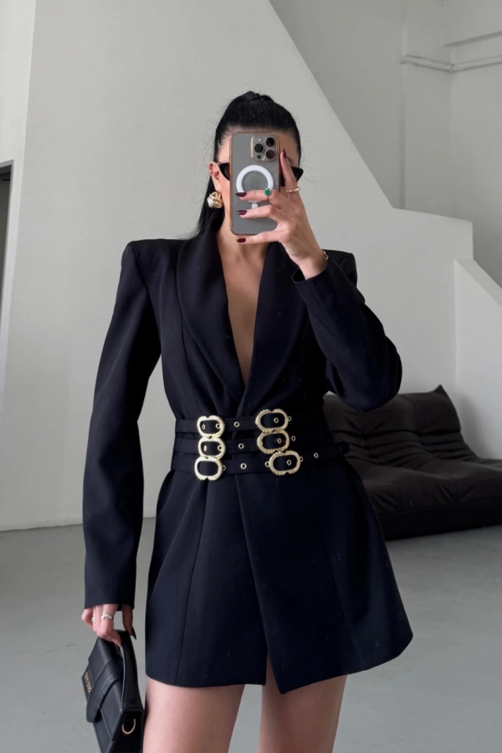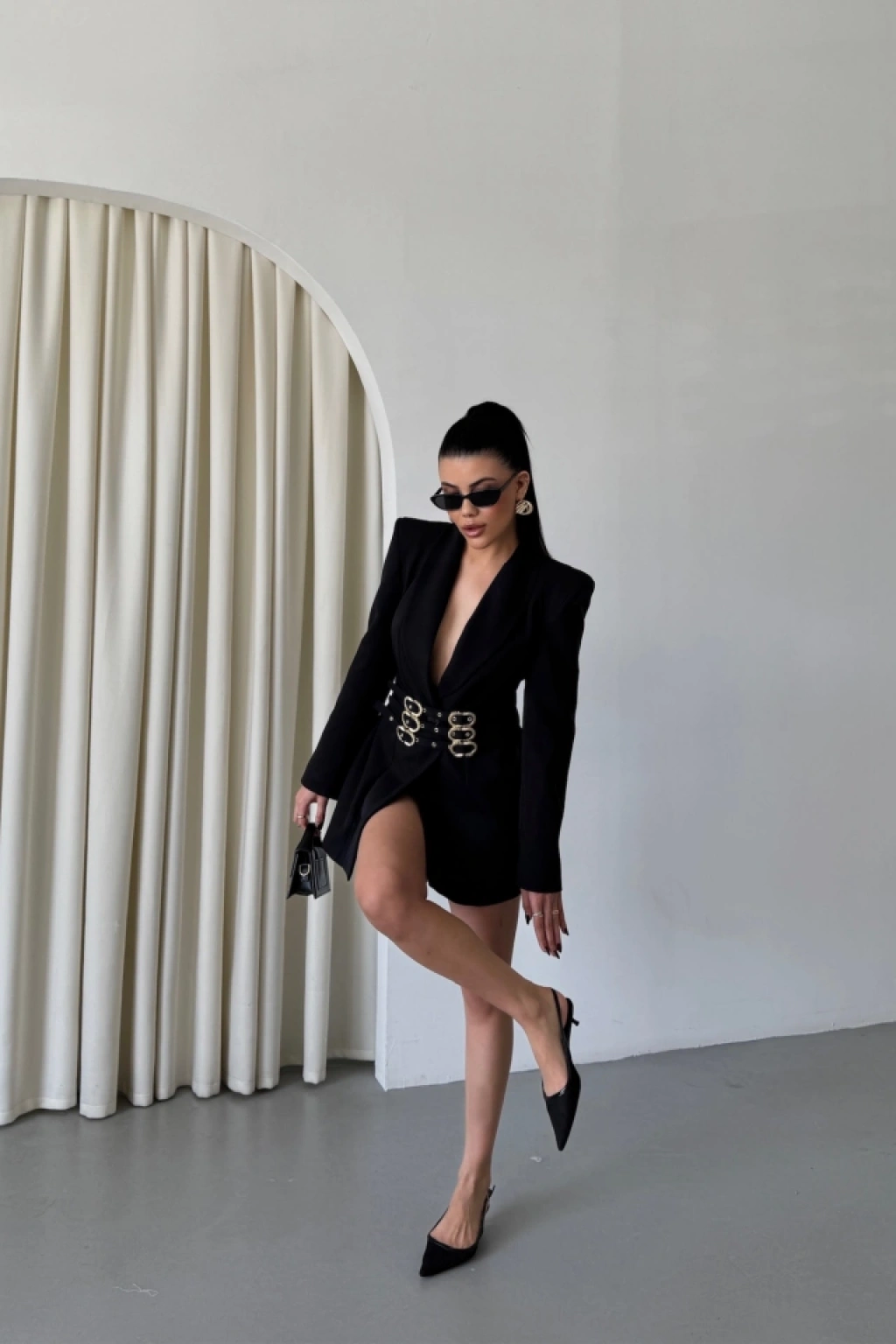TEK DÜĞME CEKET 3 TOKALI KEMER SÜSLÜ - Siyah