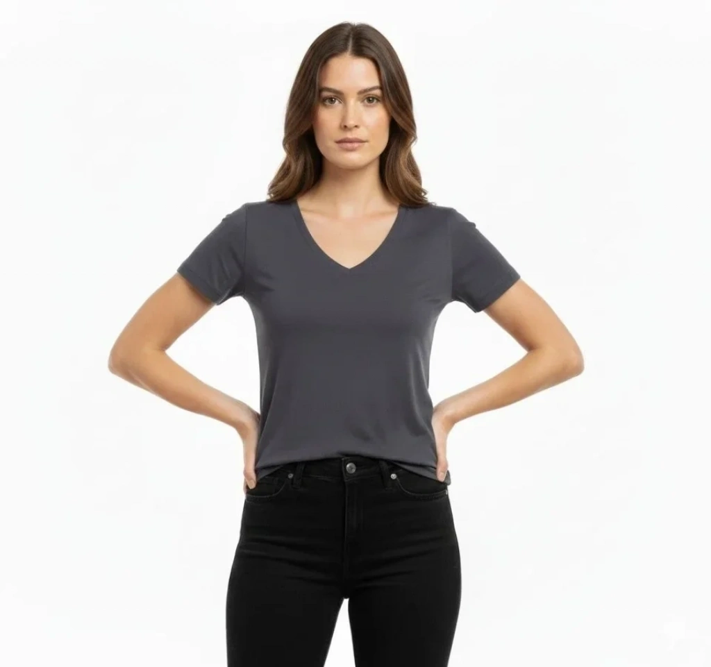 T-Shirt V Yaka Slim Fit Likralı Tişört Günlük Basic Body - Füme