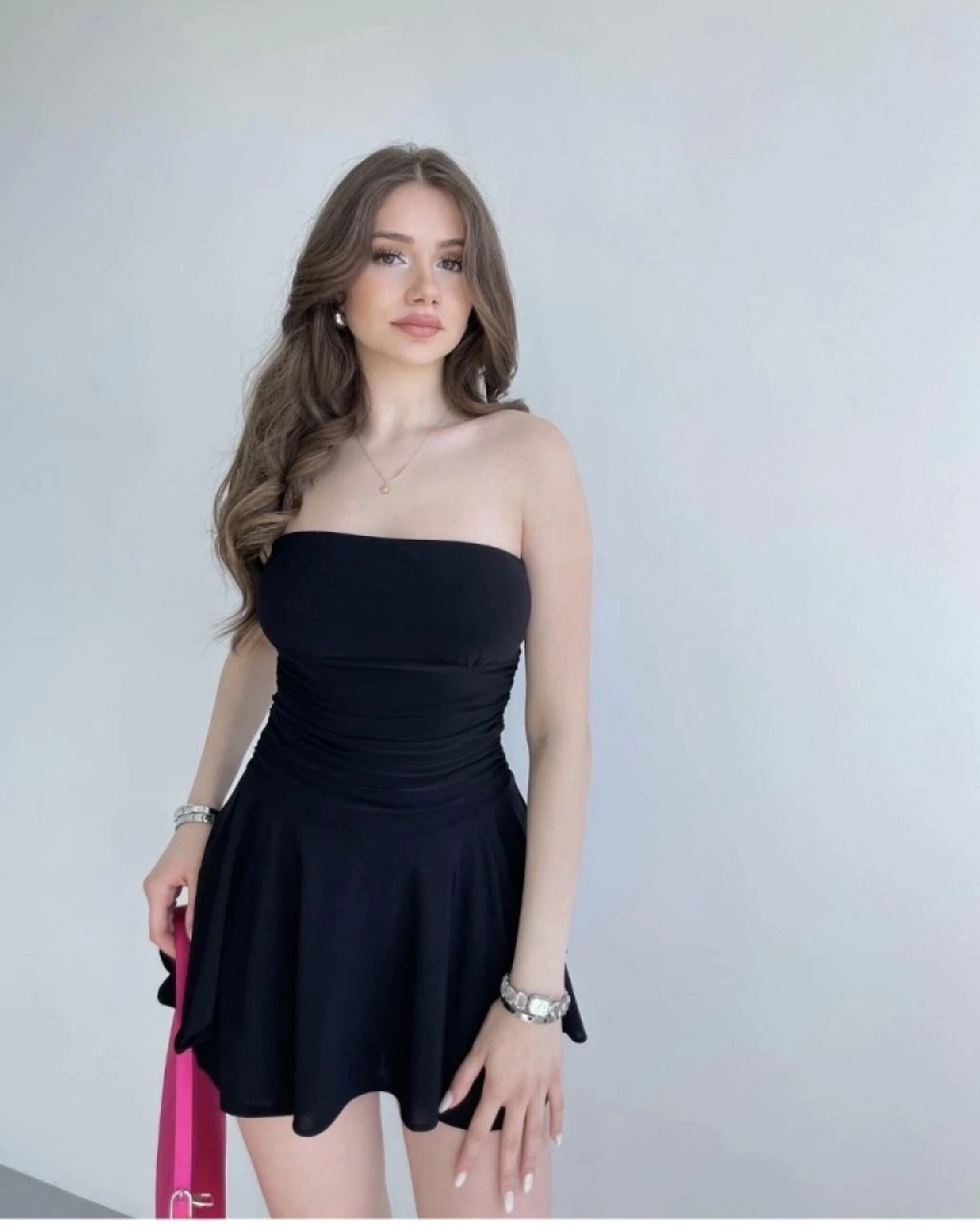 Straplez Sandy Kumaş Şortlu Prenses Etek Mini Klos Elbise- Siyah