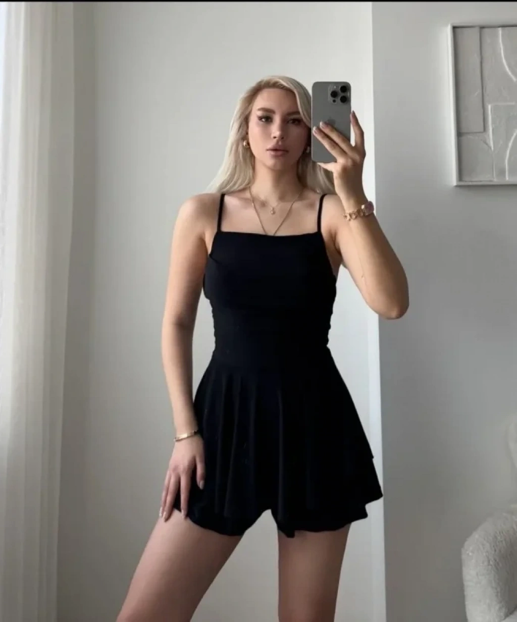 traplez ini Etek Görünümlü Şortlu Elbise Büzgülü Şık Yazlık iyah