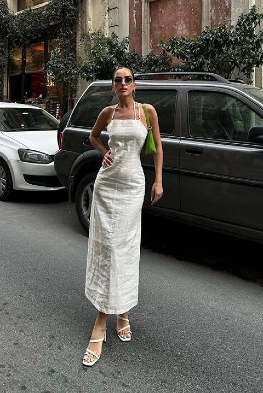 Trisha Sırt Dekolteli Keten Elbise 2496-20 ELBİSE