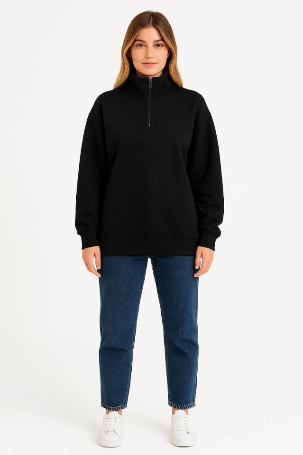 Üç İplik Dık Yaka Yarım Fermuarlı weathirt iyah