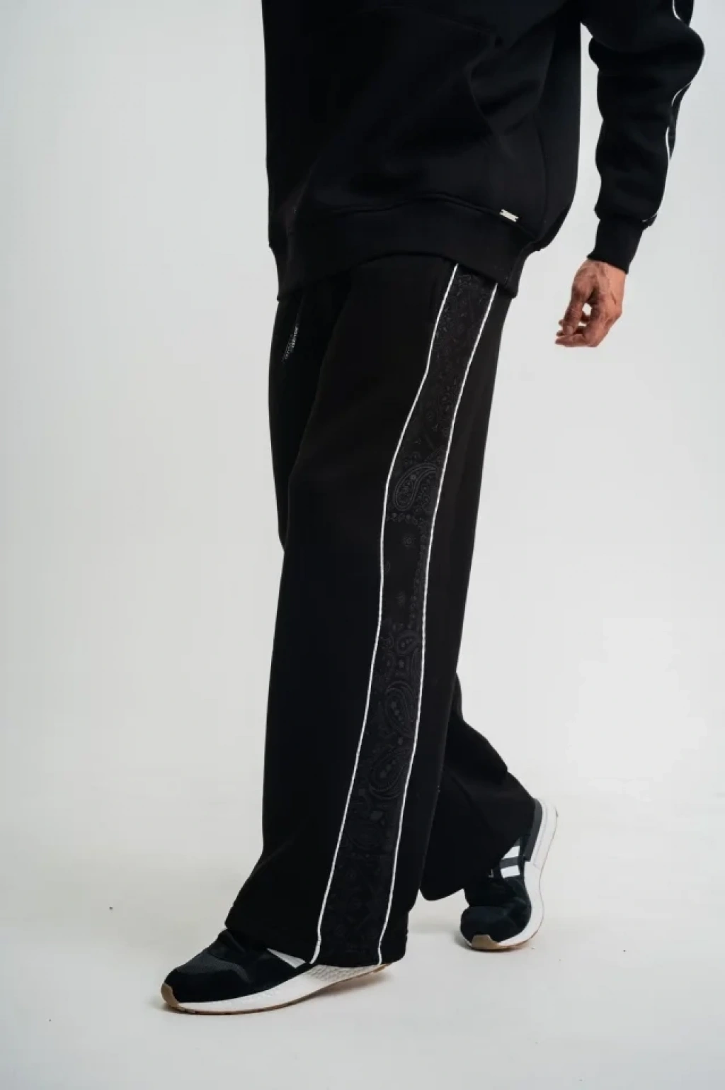Üç İplik İçi Pamuklu Ara Biyeli Baskılı Baggy Eşofman Pantolon - Siyah