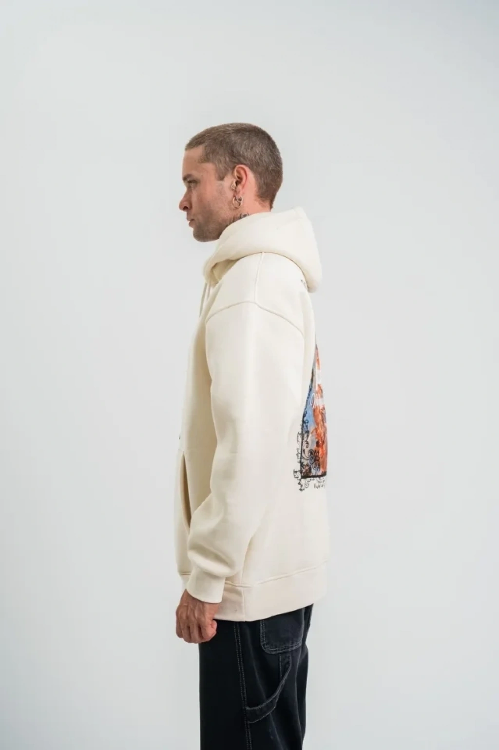 Üç İplik Kapşonlu Dijital Patchli SweatShirt Krem