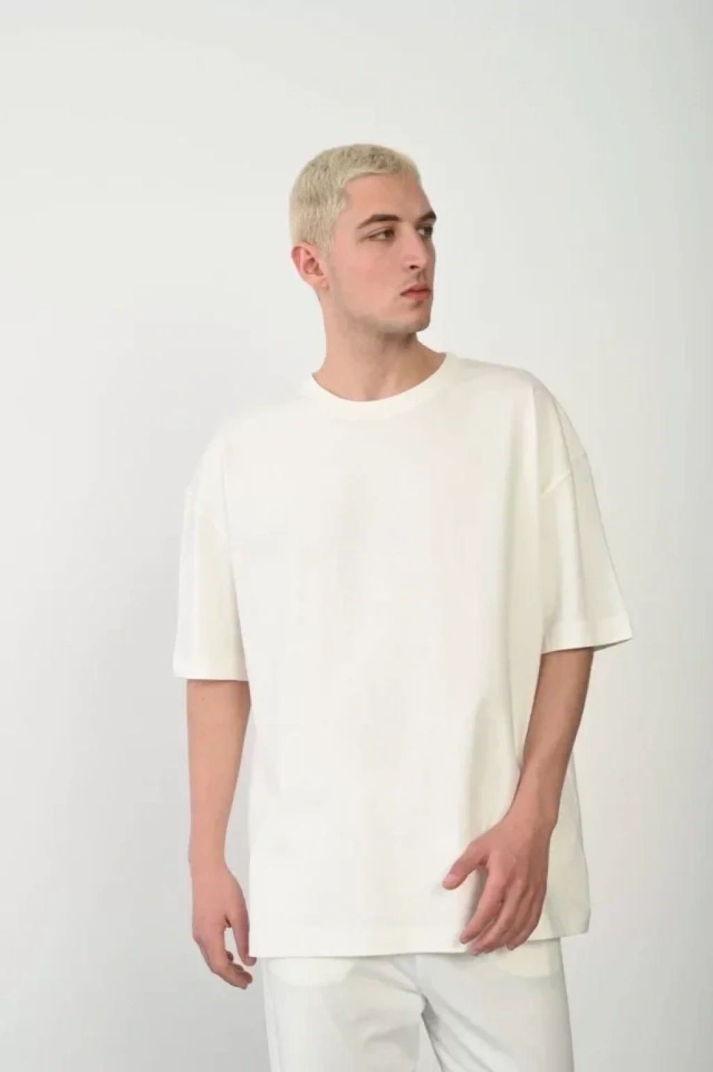 Erkek Asit Yıkama Bisiklet Yaka Kısa Kollu Oversize Thirt Tişört Beyaz