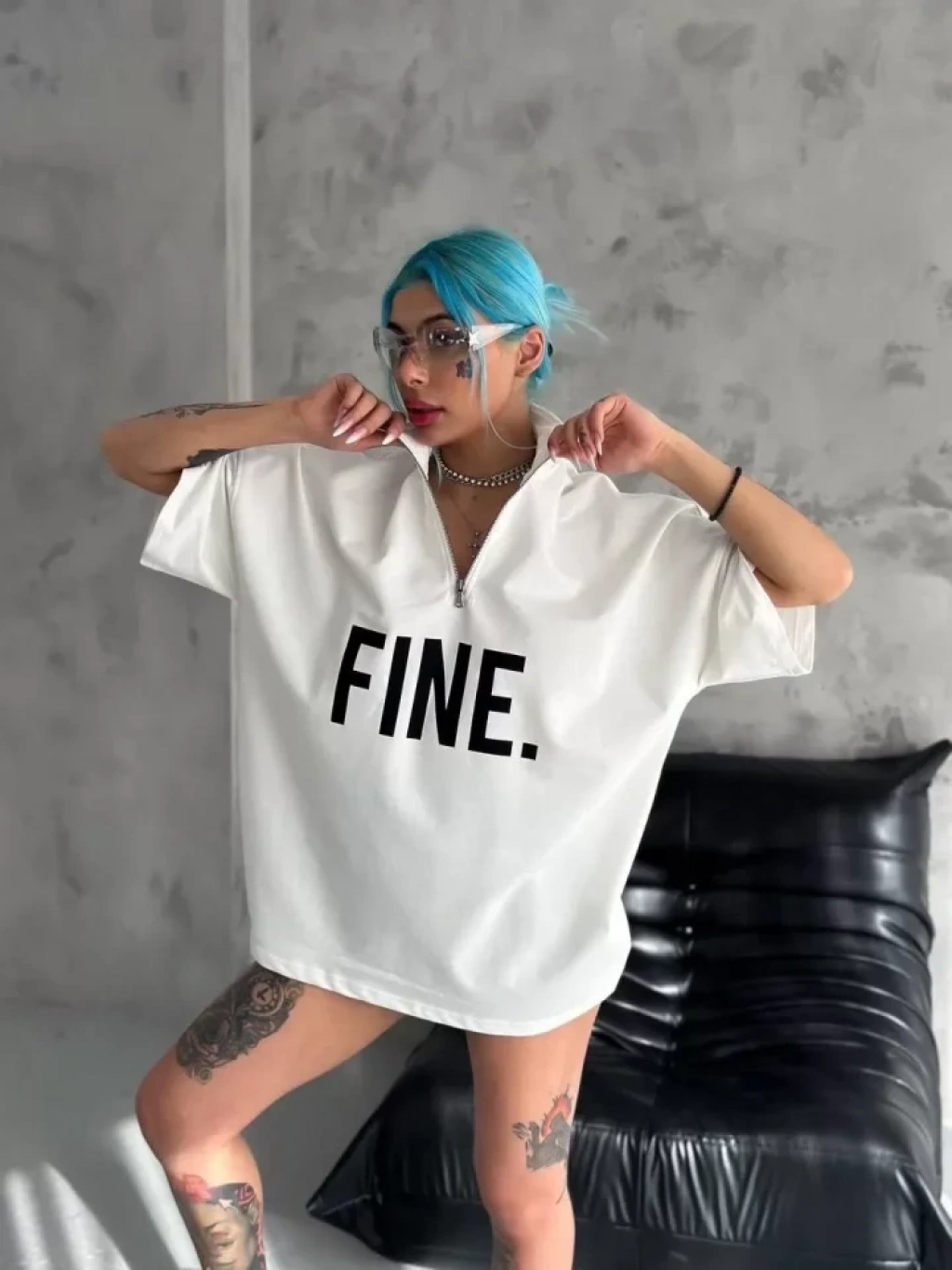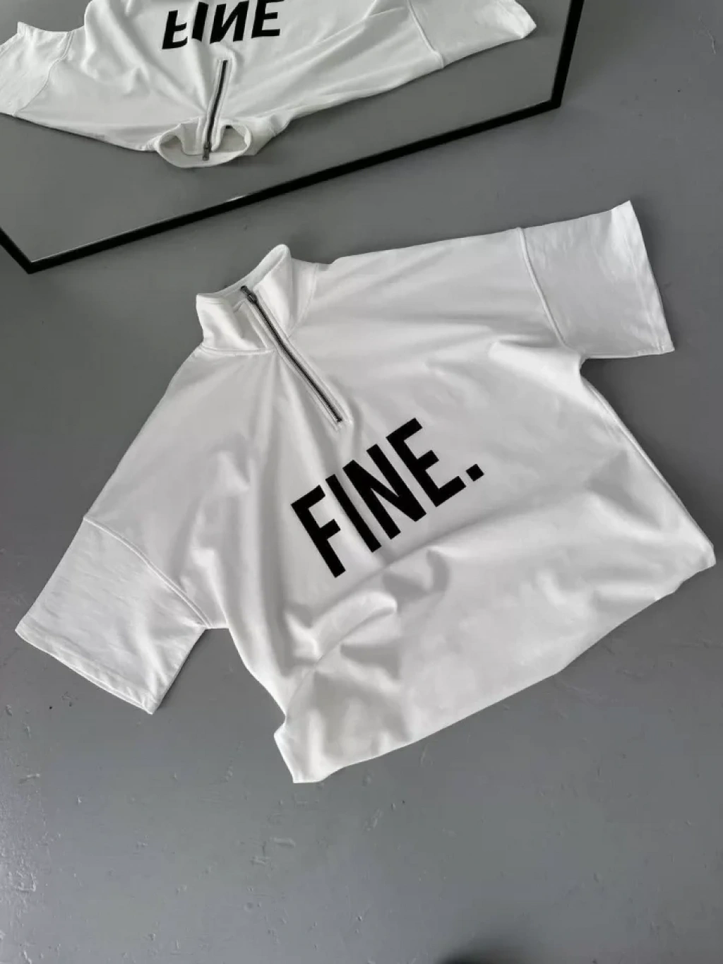 Unisex Baskılı Yarım Fermuarlı T-Shirt - Beyaz