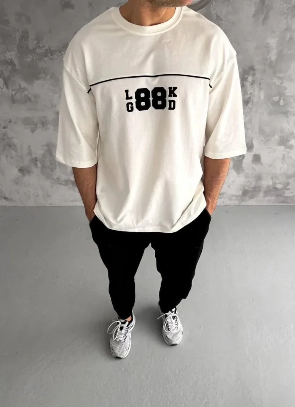 Unisex Bisiklet Yaka Baskılı Oversize Thirt Beyaz