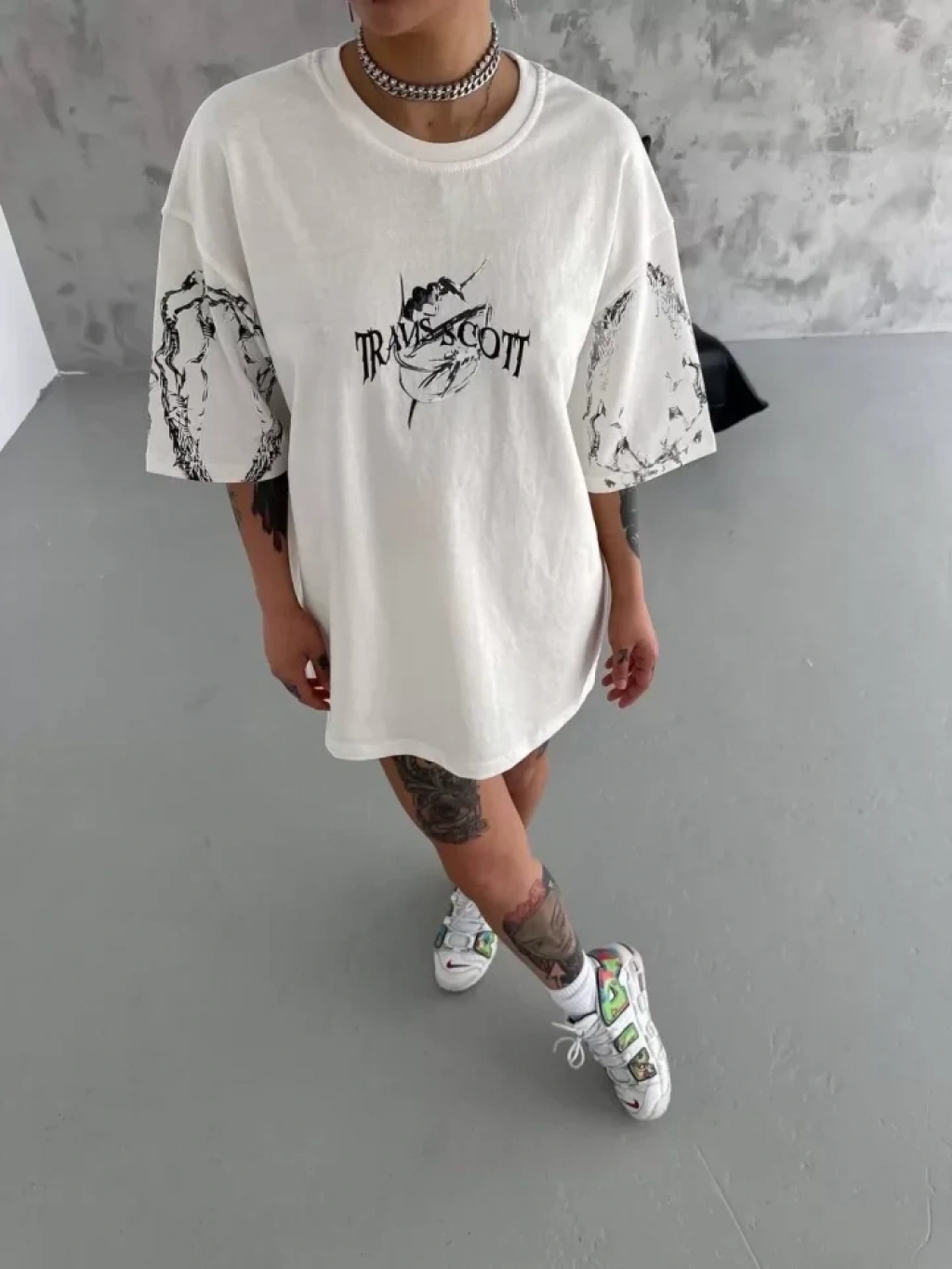 Unisex Bisiklet Yaka Baskılı Oversize Thirt Beyaz
